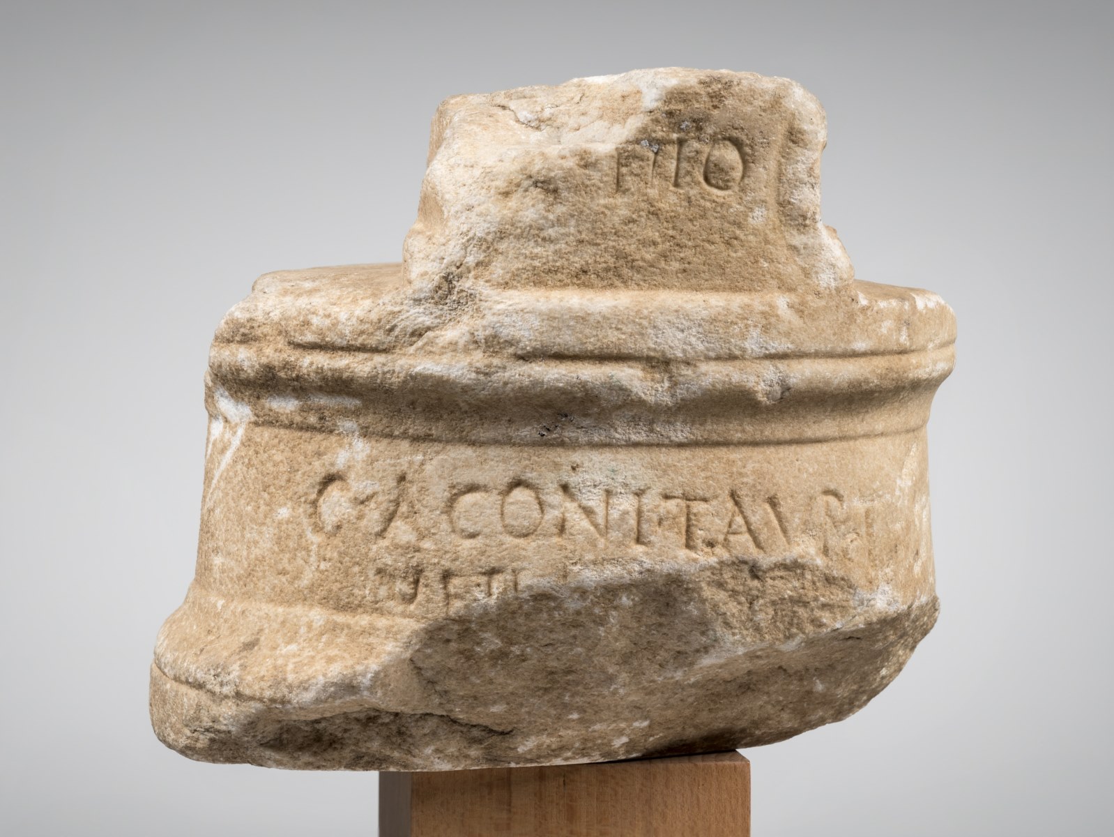 Sur cette base d'un portrait disparu, on lit GENIO C. ACONI TAURI VET. Au génie d'Aconius Taurus. En Italie, le nom d'Aconius est connu dans le milieu sénatorial romain. Au XVIIe siècle, le site de Chiragan était localement appelé Angonia, du nom de la villa Aconiaca. Ce portrait était-il donc celui de l'un de ces hauts fonctionnaires, propriétaires du domaine ? ; Ce piédouche mouluré, qui semble avoir été réalisé dans un marbre pyrénéen, est le seul trouvé à Chiragan qui porte une inscription. Celle-ci, (Ge)nio C. Aconi(i) Tauri vet..., laisserait entendre que Caïus Aconiuns Taurus était représenté en buste sur ce support. Le personnage n'est pas autrement connu, même si la gens Aconia est souvent attestée par l'épigraphie pour avoir fourni des sénateurs et des chevaliers qui ont occupé d'importantes fonctions civiles, militaires et sacerdotales en différents points de l'empire romain. L'hypothèse a été faite par H. Graillot qu'il pourrait s'agit de l'un des fastueux maîtres de la villa-palais élevée sur le site de Chiragan, la villa aconiana ou aconiaca dont le nom se serait perpétué sous la forme Angonia qui désignait encore, au XVIIe siècle, tout ou partie du territoire de l'actuelle commmune de Martres-Tolosane. Cette pièce est relativement rare (elle ne figure pas dans la liste de H.R. Goette dans Römische Mitteilungen, XCII, 1985, p. 304-318) et par là-même montre l'importance de certains portraits privés dont la fonction était bien d'éterniser le souvenir et le genius (génie protecteur) du propriétaire des lieux. Daniel Cazes