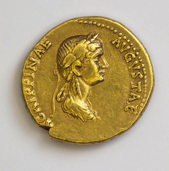 Droit : TI CLAVD. CAESAR AVG GERM P M TRIB POT P P tête laurée de Claude à droite. Revers : AGRIPPINAE / AVGVSTAE buste drapé d'Agrippine à droite, portant une couronne d'épis.