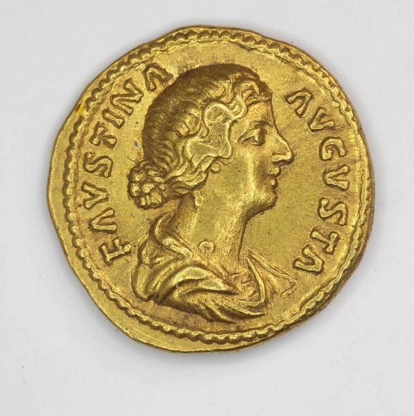 Droit : FAVSTINA / AVGVSTA buste drapé à droite. Revers : SALVATI AVGVSTAE Salus assise à gauche, nourrissant de sa patère un serpent qui s'élève au-dessus d'un autel, et le coude posé sur le dossier du siège.