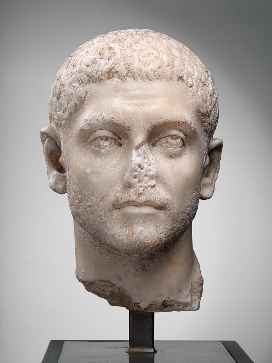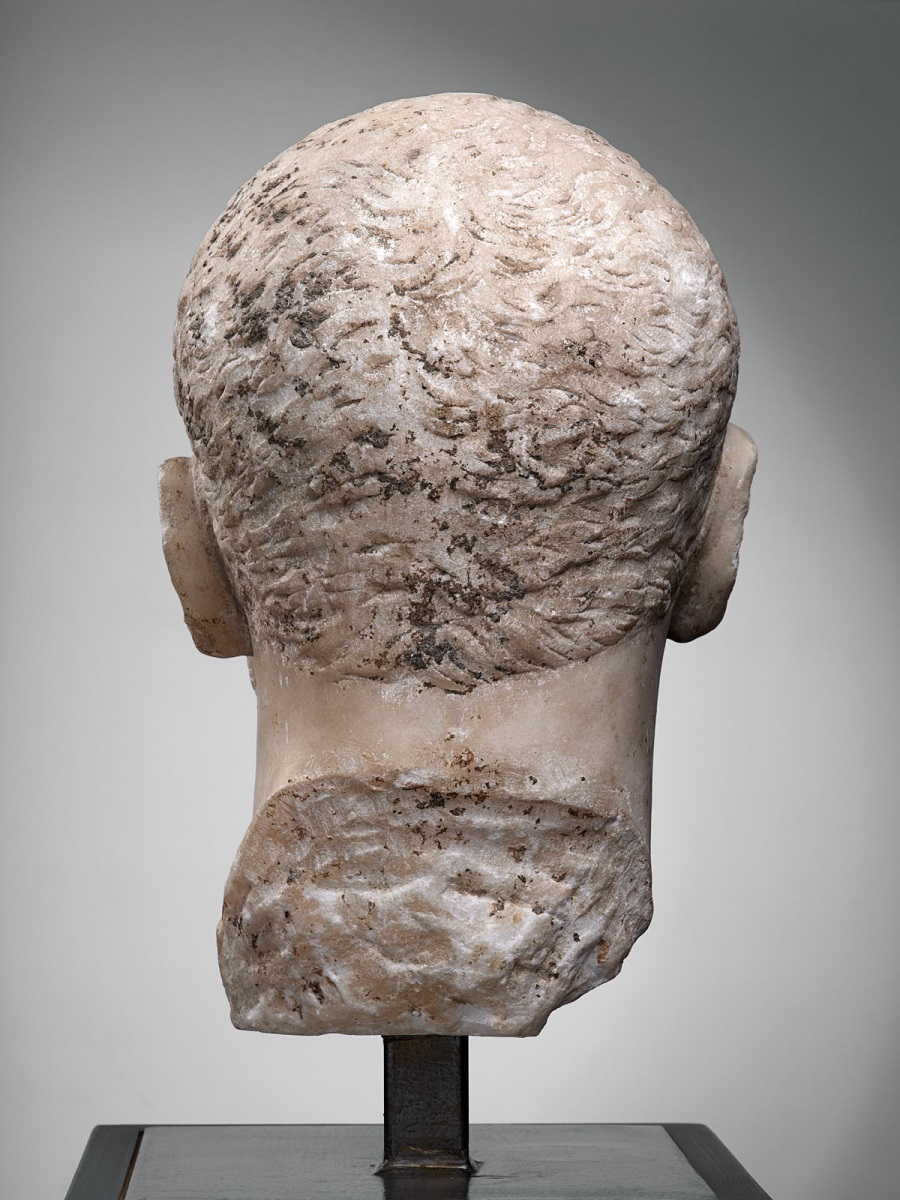 Le mouvement des courtes mèches est rendu autant par des incisions que par une recherche de volume. Barbe et moustache sont indiquées par des griffures. Les yeux relativement globuleux, les paupières supérieures lourdes et le regard dirigé vers le côté sont des caractéristiques du portrait de l'époque des Antonins, reprises par la dynastie des Sévères. Pascal Capus, 2015. ; Marbre d'Afyon (Turquie) Le mouvement des courtes mèches est rendu autant par des incisions que par une recherche de volume. Barbe et moustache sont indiquées par des griffures. Les yeux relativement globuleux, les paupières supérieures lourdes et le regard dirigé vers le côté sont des caractéristiques du portrait de l'époque des Antonins, reprises par la dynastie des Sévères. ; Le mouvement de la chevelure, coupée très court, est rendu autant par des incisions que par le volume des mèches. Barbe et moustache sont indiquées par des sortes de griffures. [Daniel Cazes]