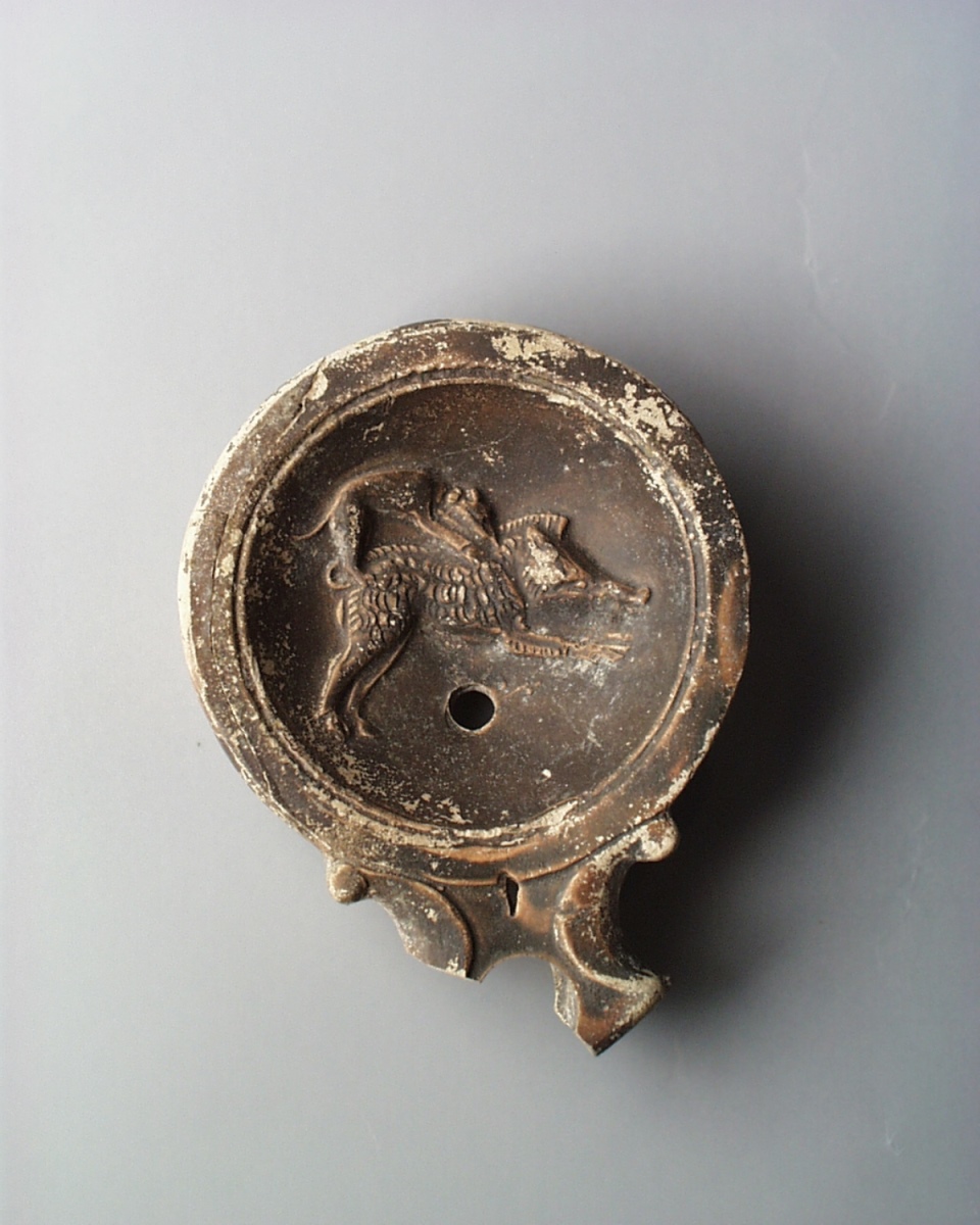 Au centre du médaillon est représentée une scène de chasse : un chien attaquant un sanglier. Le décor a nécessité le déplacement de l'orifice de remplissage dans le tiers inférieur de la lampe. Cette lampe appartient au type IV, A de Deneauve caractérisé par : un réservoir circulaire, large et un peu haut, un médaillon en cuvette, cerné par une ou plusieurs moulures, une bordure étroite, l'absence d'anse, un bec triangulaire, orné de doubles volutes serrées sur les côtés. L'orifice de sortie de mèche se situe au sommet du triangle et un petit trou d'aération en goutte d'eau est creusé sur le bec, au ras du médaillon, dont il entame la moulure extérieure (cf. Deneauve J., Lampes de Carthage, C.N.R.S., Paris, 1969).