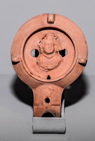 type Deneauve IX A. Terre cuite orangée, très fine (type sigillée lisse africaine) ; Firmalampen dont le canal n'est pas vraiment formé. Sans anse, le médaillon est occupé par un buste d'enfant joufflu, portant une bulla, peut-être Harpocrate ?