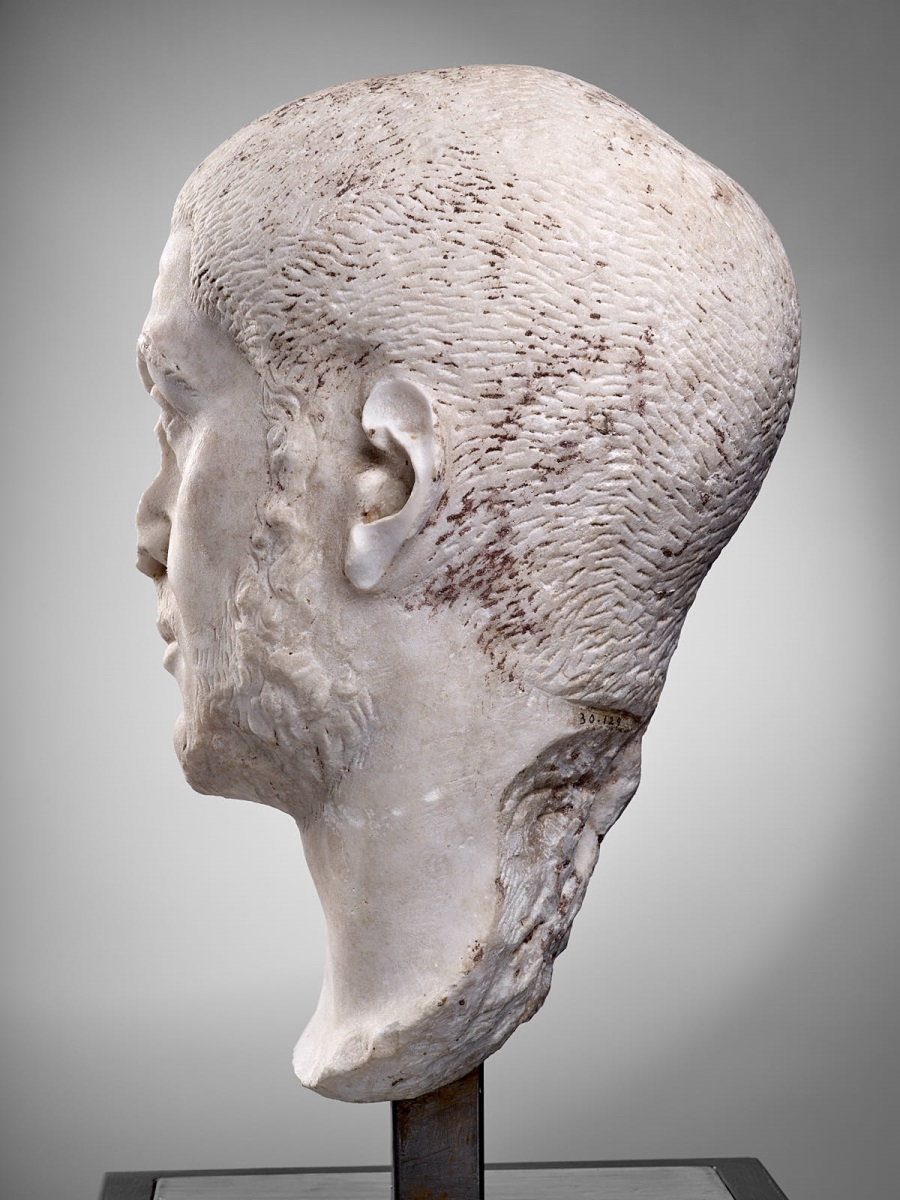 Les grands yeux avec indication du creusement de l'iris, la chevelure près du crâne traitée en petits coups de ciseaux rapprochés (dit a penna) et le collier de barbe abondant avec une moustache très fine sont caractéristiques des portraits du IIIe siècle. L'inquiétude du regard et les rides d'expression profondément creusées expriment le nouveau tournant pris par l'art du portrait romain en cette période de crises (gouvernementale, économique, financière et sociale) et d'interrogations. On a anciennement reconnu ici Volusien, empereur de 251 à 253. Pascal Capus, 2015. ; Marbre de Göktepe (Turquie) Les grands yeux avec indication du creusement de l'iris, la chevelure près du crâne traitée en petits coups de ciseaux rapprochés (dit a penna) et le collier de barbe abondant avec une moustache très fine sont caractéristiques des portraits du IIIe siècle. L'inquiétude du regard et les rides d'expression profondément creusées expriment le nouveau tournant pris par l'art du portrait romain en cette période de crises (gouvernementale, économique, financière et sociale) et d'interrogations. On a anciennement reconnu ici Volusien, empereur de 251 à 253. ; De denses piquetages mettent plus en valeur la conformation crânienne, jusque dans tous ses reliefs, que le système capillaire. La tension des traits traduit une certaines anxiété. [Daniel Cazes]