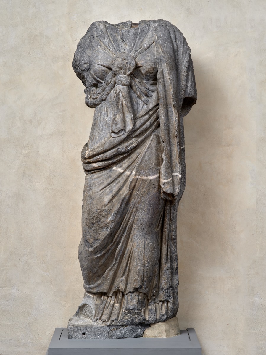 Cette sculpture en marbre noir de Saint-Béat (Haute-Garonne) est la plus grande statue découverte à Chiragan. Privée de sa tête, l'œuvre mesure 1,87 mètre de haut. Elle se distingue aussi par son matériau, un marbre noir veiné de blanc, choisi par le sculpteur afin de traduire le vêtement sacré de la déesse, noir et bordé d'une frange caractéristique. Plusieurs pans de celui-ci sont ramenés au centre du buste et entre les seins, où ils sont maintenus par un grand nœud dit "nœud isiaque". Des cavités avaient été réservées afin de loger les pieds, les bras et la tête probablement taillés dans un marbre de couleur différente. Tous ont disparu. La dimension de l'œuvre est à la mesure de l'importance acquise par la déesse sous l'Empire romain. Divinité syncrétique en des temps où se développe le monothéisme, elle fut considérée comme la déesse majeure, maîtresse de l'univers, créatrice, régulatrice et bienfaitrice des activités humaines, inspiratrice de la justice et des préceptes moraux les plus élevés.