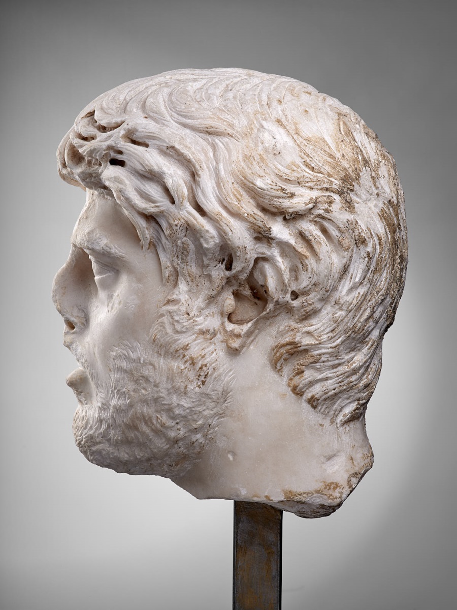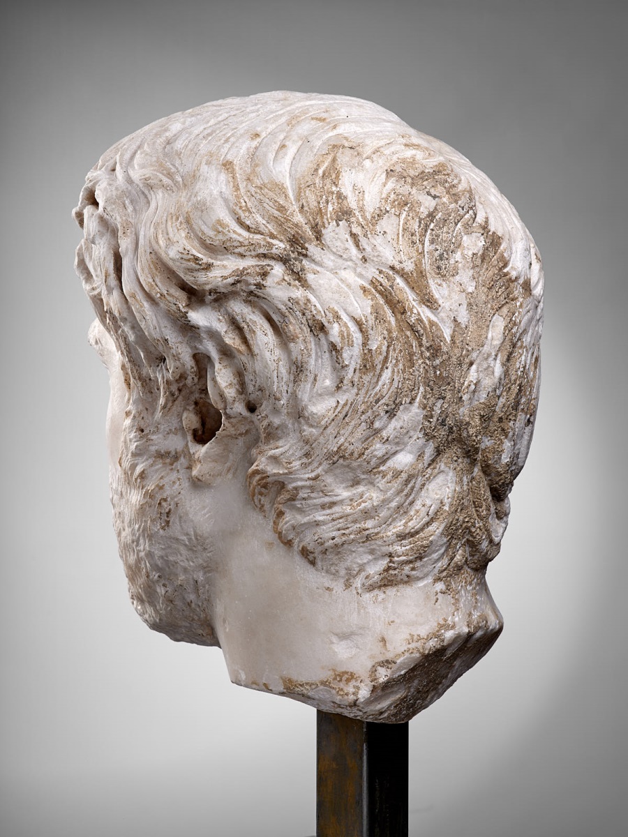 Les larges boucles très souples forment une épaisse chevelure. Le sculpteur privilégie ici le ciseau, qui permet de graver avec finesse chaque détail capillaire, plutôt que le trépan, très utilisé pour les portraits de Lucius Verus ou de Septime Sévère, dont les cheveux et la barbe frisés autorisaient le creusement puissant du marbre. On reconnaît le même personnage dans un portrait conservé à Pérouse (Ombrie, Italie), provenant de Rome ou du centre de l'Italie. Pascal Capus, 2015. ; Marbre de Göktepe (Turquie) Les larges boucles très souples forment une épaisse chevelure. Le sculpteur privilégie ici le ciseau, qui permet de graver avec finesse chaque détail capillaire, plutôt que le trépan, très utilisé pour les portraits de Lucius Verus ou de Septime Sévère, dont les cheveux et la barbe frisés autorisaient le creusement puissant du marbre. On reconnaît le même personnage dans un portrait conservé à Pérouse (Ombrie, Italie), provenant de Rome ou du centre de l'Italie. ; Y transparaît le goût pour l'augmentation du volume et l'animation de la chevelure. D'épaisses et longues mèches suivent un parcours sans ordre, sauvage, s'entremêlant. Barbe, moustache et sourcils sont finement gravés. [Daniel Cazes]