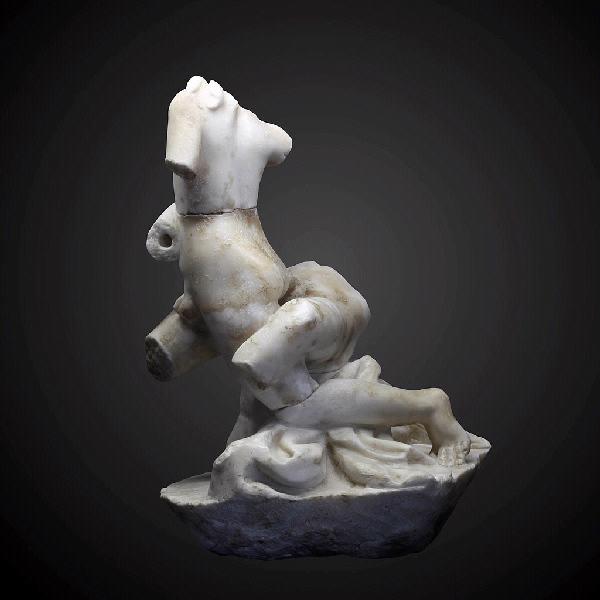 Cette petite sculpture en ronde bosse illustre la lutte entre Hermaphrodite et un satyre, créature mi-homme mi-bouc de l'entourage du dieu du vin, Dionysos. Hermaphrodite est le fils d'Hermès et Aphrodite. Une nymphe, Salmacis, tomba éperdument amoureuse de lui et fit le voeu de ne plus faire qu'un avec lui. Son voeu fut exaucé et le couple ne forma plus qu'un seul être avec des attributs masculins et féminins. Dans l'iconographie romaine, Hermaphrodite est souvent représenté avec un ou des satyres. Marie Nonclercq, 2016.