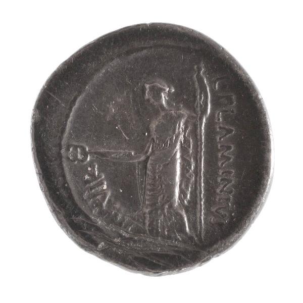 Droit : Anépigraphe - Tête laurée de César à droite. Revers : L. FLAMINIVS - IIII. VIR - Divinité féminine (Vénus ?) debout à gauche, tenant un caducée à l'horizontal et un long sceptre droit. Texte : Marie-Laure Le Brazidec, 2017