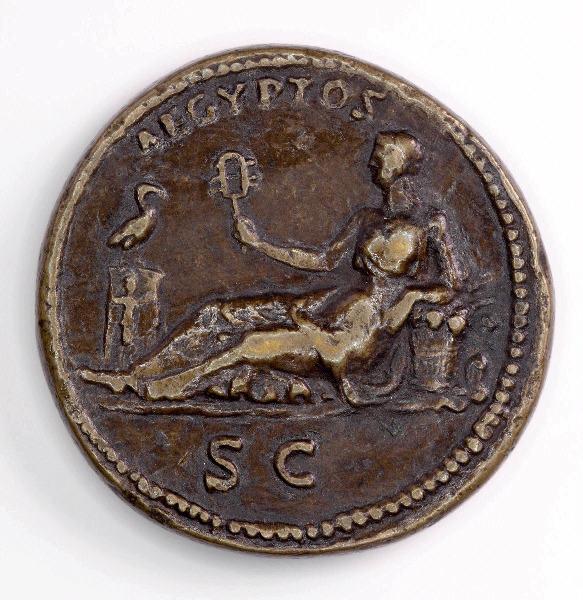Au droit : HADRIANVS - AVG COS III P P - Tête laurée d'Hadrien à droite. Au revers : AEGYPTOS // S C - L'Egypte adossée à gauche, tenant un sistre, son coude appuyé sur un panier de fruits ; devant, un ibis sur une colonne. Texte : Marie-Laure Le Brazidec, 2017