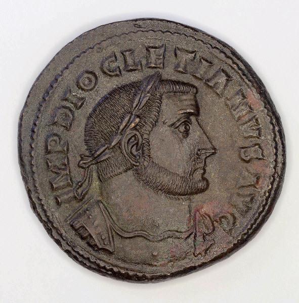 L'empereur Dioclétien est originaire de Split en Dalmatie (actuelle Croatie). Il prend le pouvoir fin 284 et s'adjoint un césar, Maximien, dès 285 afin de l'aider à gérer l'Empire. En 286, Maximien devient également empereur, Dioclétien créant alors un nouveau régime politique, la Dyarchie. Au revers, GENIO POPVLI ROMANI : « au Génie du Peuple romain ». Le type du Génie apparaît avec la réforme monétaire de Dioclétien de 294, créant une nouvelle monnaie de bronze argentée, le nummus. Le Génie tient une patère et une corne d'abondance ; il est coiffé du modius (unité de mesure romaine pour le blé) et porte un manteau sur l'épaule gauche. LG : atelier de Lyon ; P : initiale pour Prima, nom de l'officine où la monnaie a été produite, l'atelier pouvant en compter plusieurs. L'étoile dans le champ (espace libre) et l'autel allumé permettent de dater l'émission des années 304-305. L'autel est caractéristique des frappes lyonnaises. Pascal Capus et Marie-Laure Le Brazidec, 2016