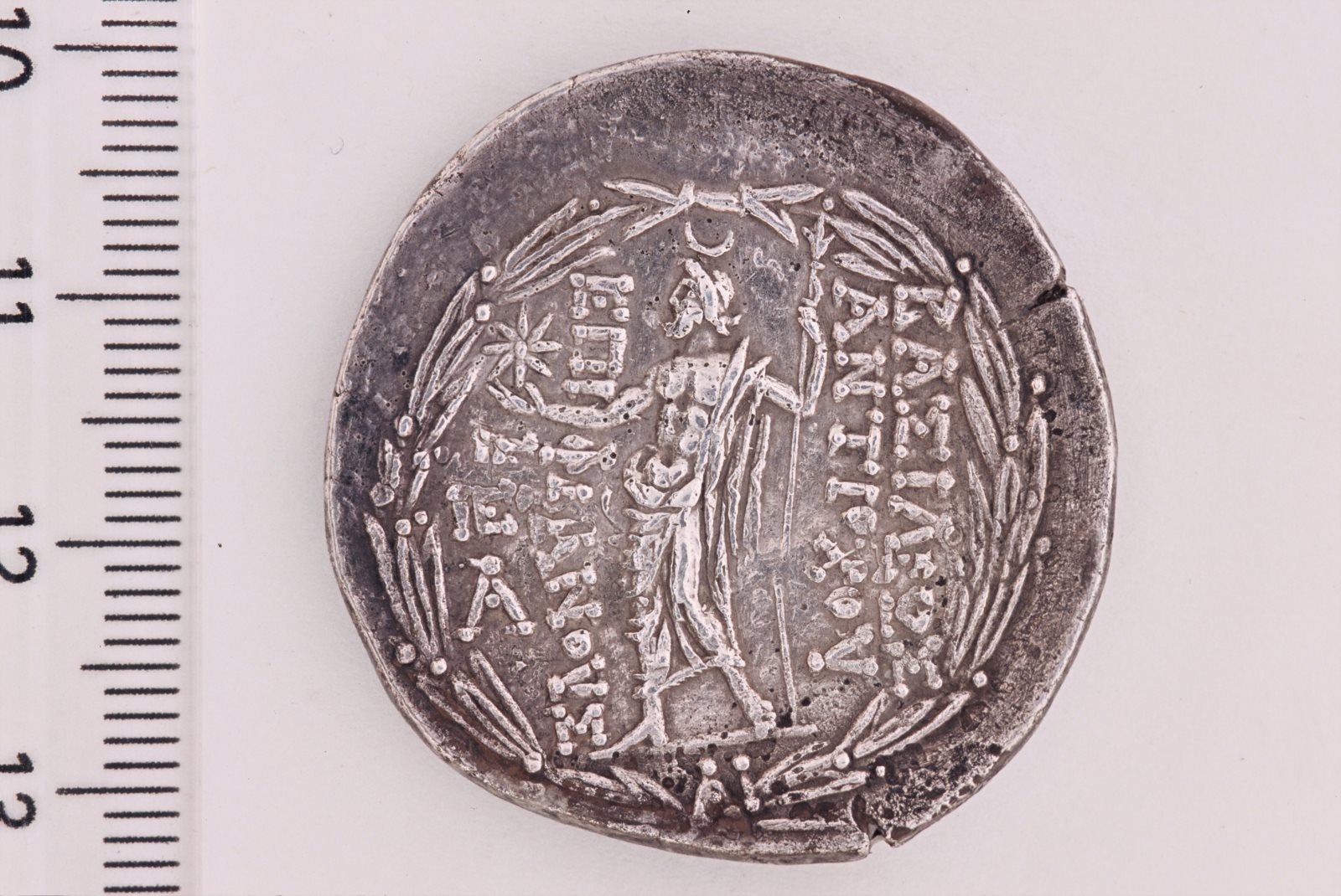 (Antiochos VIII, zeus, tête diadémée, croissant de lune, étoile, sceptre)