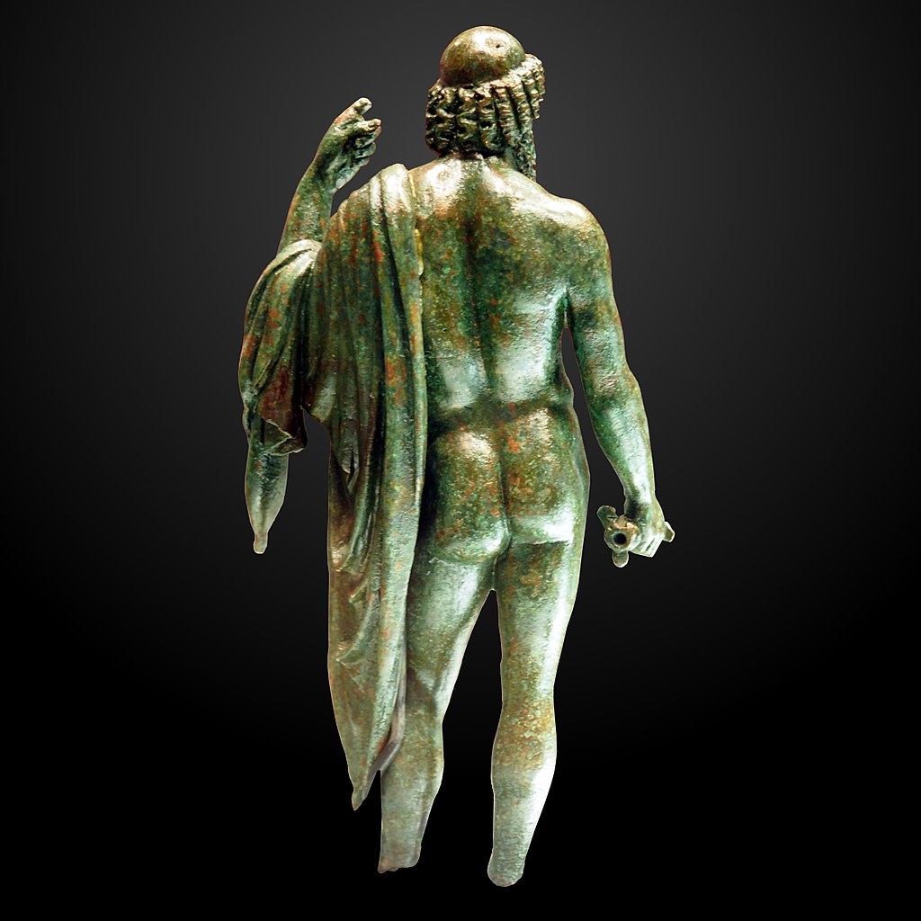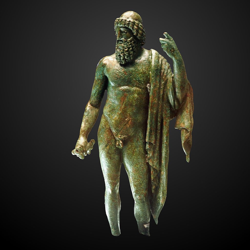 La divinité debout, prend appui sur sa jambe droite, pied gauche légèrement en avant, tandis que le bras gauche replié devait s'appuyer sur la hampe du sceptre, aujourd'hui disparu. Dans sa main droite, il tient le foudre dont le faisceau d'éclairs est perdu, peut-être était-il en argent ? Le bras gauche et la draperie, d'une facture remarquable, ont été moulés à part. Découverts séparés, ils conservaient, néanmoins, des vestiges du scellement au plomb qui n'avait pas résisté à l'enfouissement. Si le corps s'apparente au modèle hellénistique, la tête quant à elle, n'est pas sans rappeler les modèles du premier art classique grec du Ve siècle avant notre ère dit style sévère. Ce mélange des genres est tout à fait caractéristique du goût hellénisant de l'époque romaine à partir de l'empereur Auguste (-27/+14). Évelyne Ugaglia, 2014