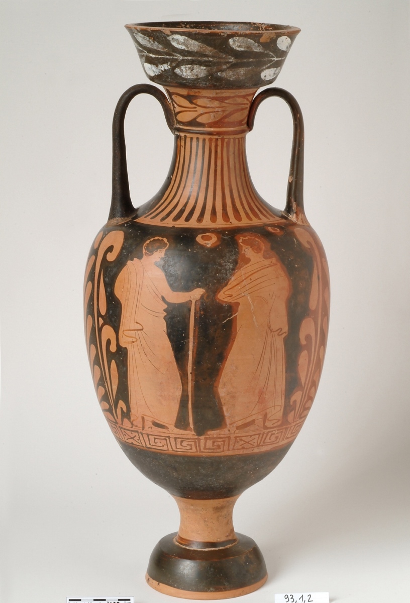 Technique : Argile beige rosé. Vernis noir brillant. Pas de ligne en relief pour les contours. Rehauts blancs : guirlande de feuilles de laurier, bandeau, bandelette, couronnes, lignes de sol, chausses, rameau végétal, bijoux et xylophone. Forme : Panse allongée, légèrement ovoïde. Pied en disque épais évasé avec un filet réservé en bas de la tranche. Tige réservée avec un filet noir sur le bas. Décor : Sur la lèvre et la tranche, guirlande de feuilles de laurier à gauche ; sur l’épaule, rangée de longues languettes ; sous la scène, frise de méandres, interrompue par des motifs de croisillons en sautoir pointés encadrés ; sous les anses, palmette encadrée par un rinceau végétal stylisé, avec volutes et feuilles. Sur la panse : Face A : A gauche, une femme vêtue d’un chiton, parée de bijoux et coiffée d’un diadème, tient un xylophone de sa main droite et un coffret décoré de sa main gauche, d’où pend une bandelette ; à droite, jeune homme couronné, assis sur un himation. Il tient un rameau fleuri, avec des baies de sa main gauche et tend une couronne de sa main droite ; dans le champ, une couronne et une bandelette ; présence de deux lignes de sol marquées par deux double rangées de points. Face B : Deux hommes drapés dans un himation, face à face. Celui de gauche avec un bâton. Dans le champ, deux couronnes. Commentaire : L’utilisation de croisillons en sautoir pointés et le traitement des himatia des jeunes hommes de la face B sont les éléments stylistiques qui ont permis à Trendall d’identifier le Peintre de Woburn Abbey comme étant l’auteur de cette amphore. Sur les motifs de croisillons, voir l’amphore de Bologne (RVAp., p.326, n°76), de Naples (RVAp., p.326, n°75) ou celle de Trieste (RVAp., p.326, n°80), très proche du style de ce peintre. Sur la face B, les plis rayonnants issus du bras gauche plié, le trait en vernis délayé en double vague de l’himation et le pli en « z » de la manche sont caractéristiques de ce peintre. On les retrouve notamment sur le cratère éponyme du peintre (RVAp., p.325, n°68). Le jeune homme de gauche, tenant un bâton, est identique à celui de l’amphore de Bologne (RVAp., p.325, n°73), tout comme le rinceau végétal stylisé à volutes et les feuilles de part et d’autre de la scène. Mathieu Scapin ; La lèvre haute est décorée d'une guirlande de laurier peinte en blanc tandis que le col présente une zone de languettes verticales s'interrompant sous les anses. Sur la panse, sous chacune des anses, une palmette en éventail s’étend entre deux motifs végétaux tournés vers l'extérieur. Une ligne de méandre fait le tour de la panse sous la scène figurée. Sur la face A : une conversation entre un jeune homme nu assis et une jeune femme debout vêtue d’un chiton. Le jeune homme tient un rameau fleuri et un tambourin et porte une couronne. La jeune femme présente un coffret et tient un xylophone. Sur la face B : deux jeunes hommes enveloppés dans leur himation (manteau de laine) conversent face à face. Celui de gauche s'appuie sur un bâton, élément renforçant la verticalité de la scène. Anaell Viollat, d'après la notice d’Évelyne Ugaglia extraite du catalogue « L'art grec au musée Saint-Raymond », 1993.