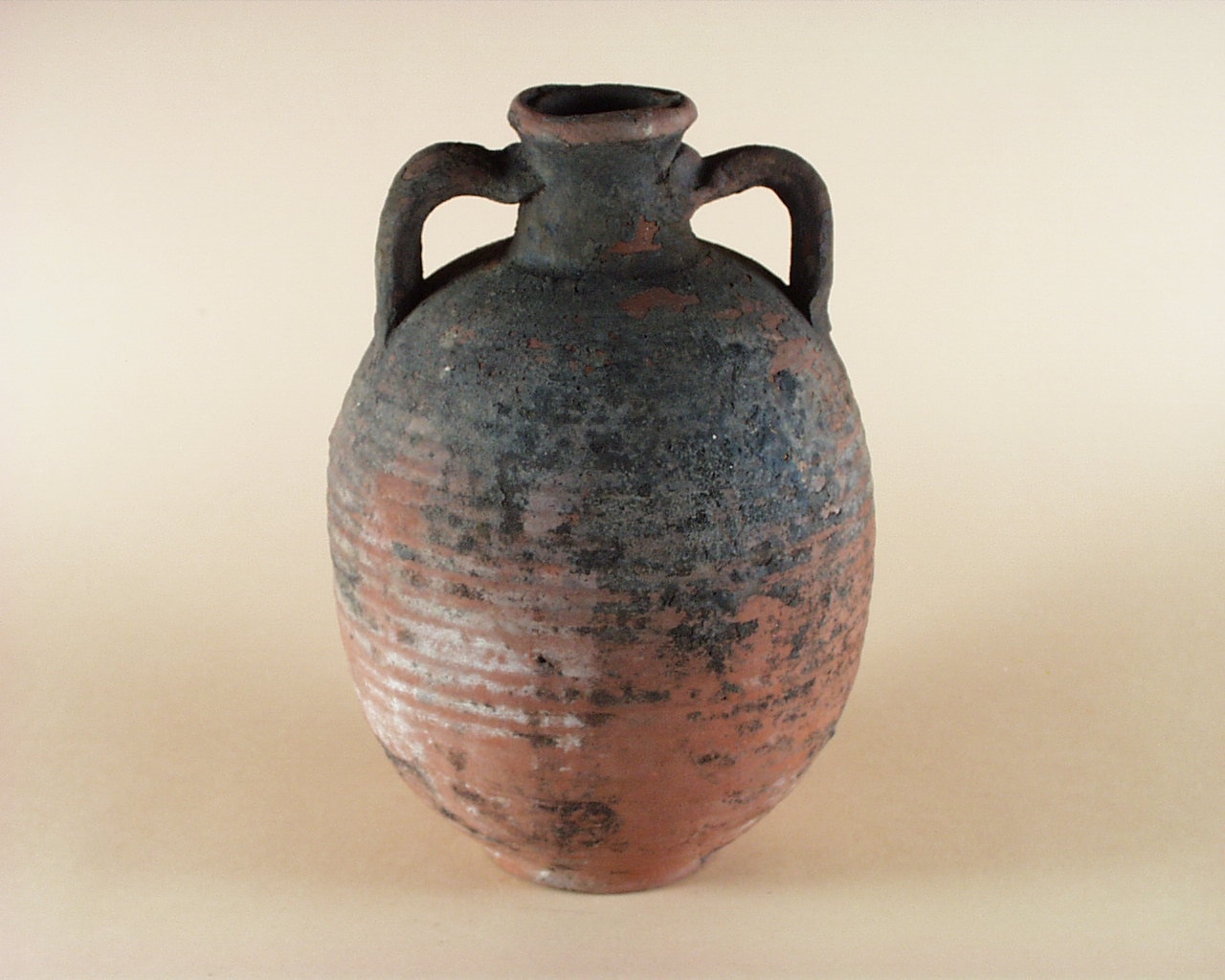 Panse ovoïde cannelée, deux anses, base annulaire, col droit, lèvre débordante. Caroline Biro, 2002