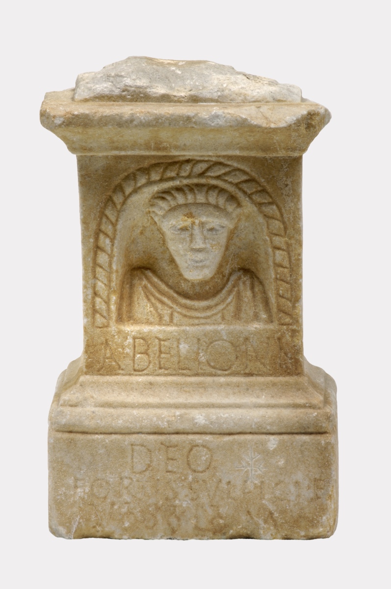 Autel votif décoré d'un buste du dieu Abelio(n), accompagné d'une dédicace à ce dieu par Fortis