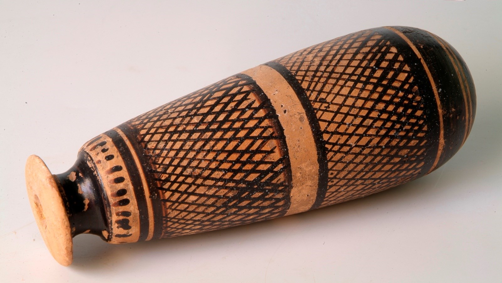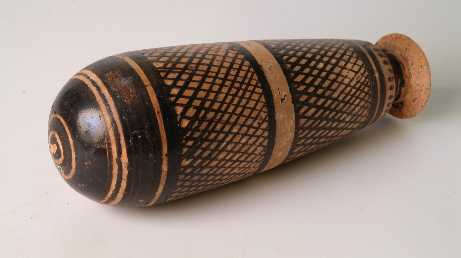 Alabastre fusiforme ; lèvre plate débordante, col étroit ; fine moulure à la jonction du col et de la panse. Vernis noir brillant sur la lèvre, le col, le haut et le bas de la panse. Rehaut crème sur la tranche de la lèvre, un filet en haut de la panse, la majeure partie de la panse, un filet et un double filet. Sur la panse, décor réticulé : deux zones de quadrillage oblique sur fond blanc entre d'épais filets noirs, que sépare une bande en réserve recouverte de blanc. Hélène Bordier