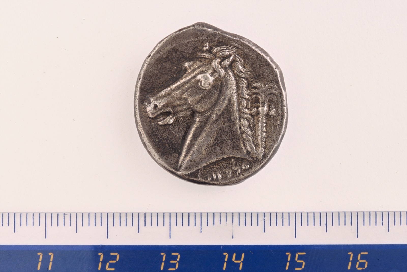 D/ Tête de Tanit à gauche, portant une couronne et un collier. Tout autour, quatre dauphins. Grènetis. R/ Tête de cheval à gauche. Derrière, un palmier. Au-dessus, légende punique : .... Grènetis.