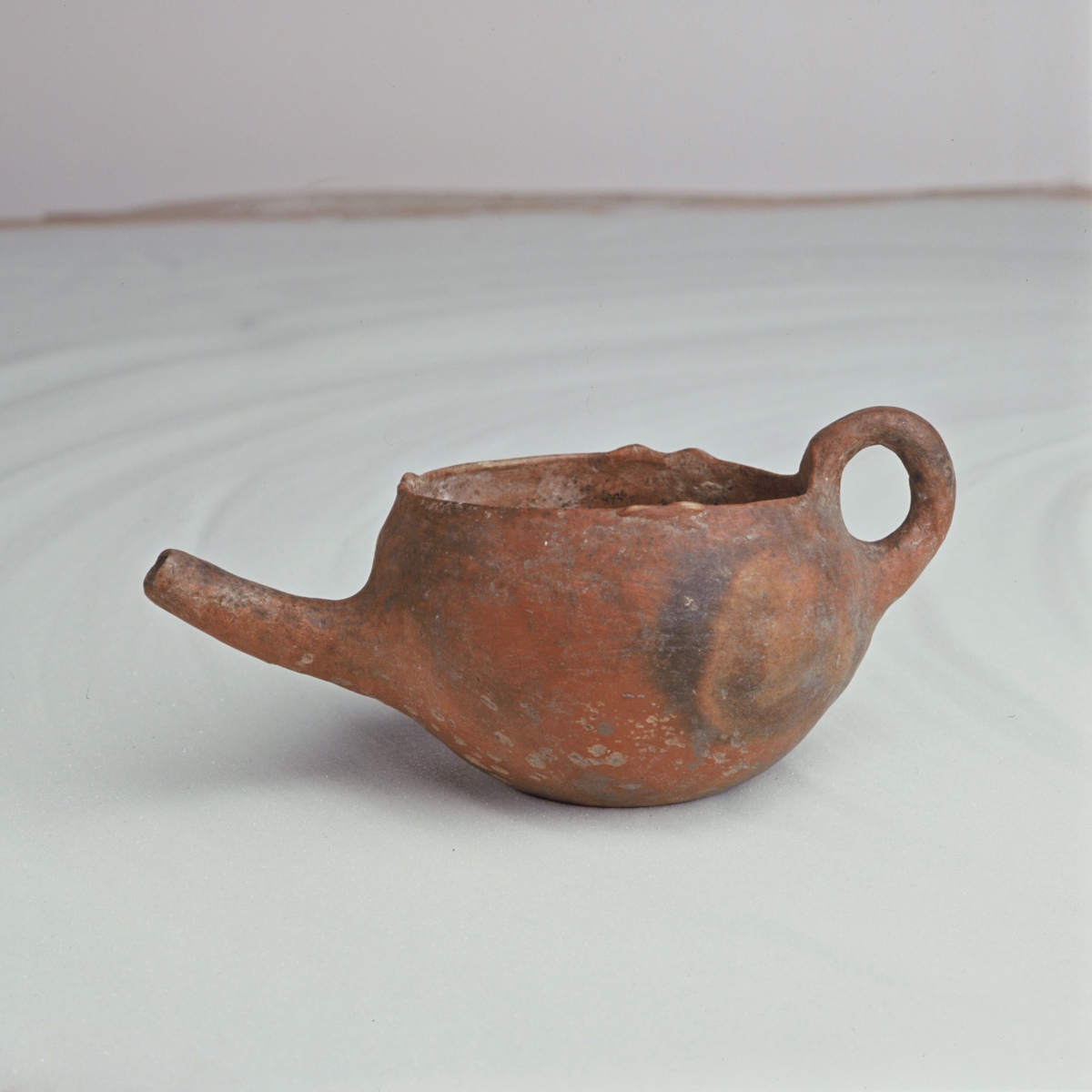 Bol façonné à la main ; surface rouge avec effet "flammé". Panse hémisphérique à rebord rentré, anse ronde du bord à l'épaule et bec tubulaire placé symétriquement, tenons sur le rebord. Ce bol relève de la tradition de céramique à surface rouge polie du Bronze Ancien qui se maintient jusqu'au Bronze Moyen. C'est une variété miniature d'une forme utilitaire très répandue de grands bols qui servaient en particulier à la traite des brebis ou des chèvres. Marguerite Yon, Périple méditerranéen, 2003