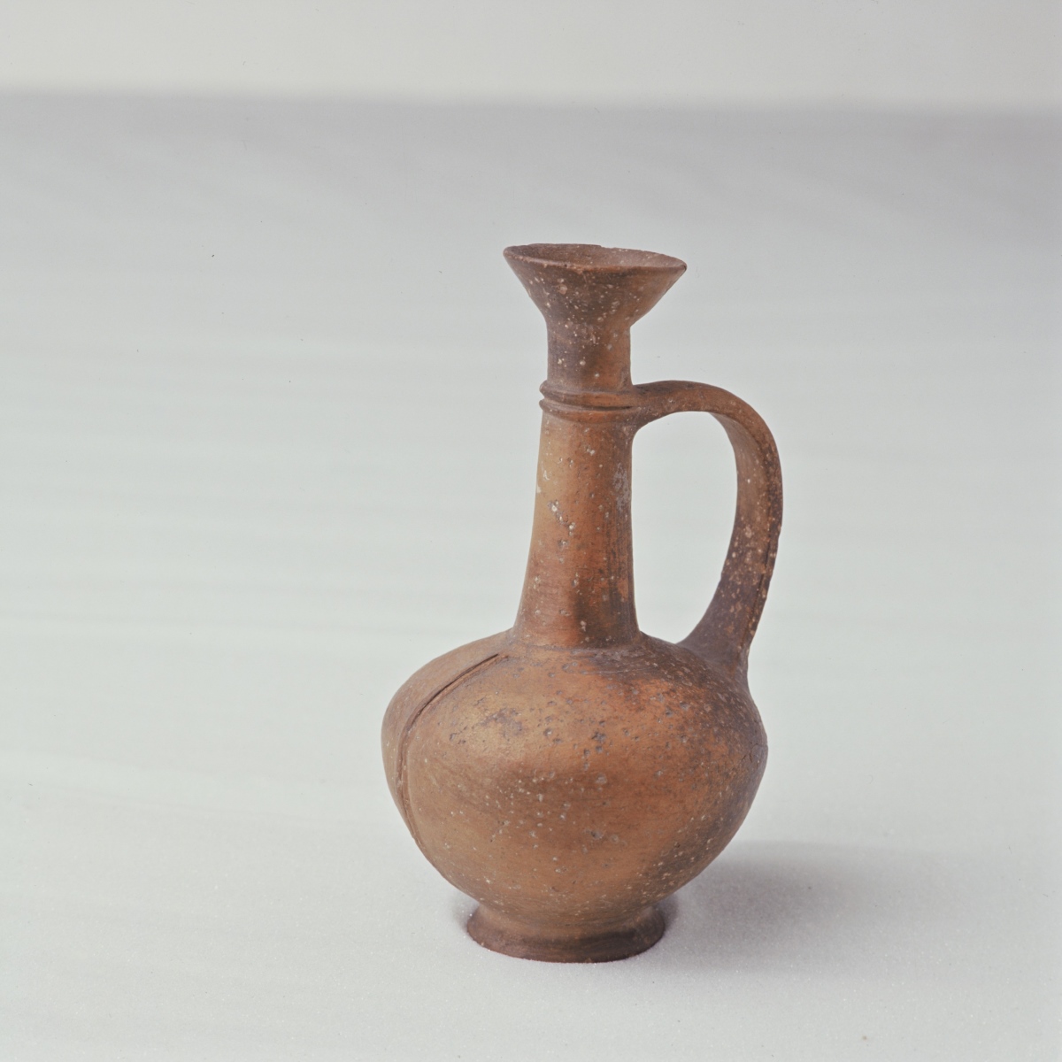 Flacon (dit aussi bilbil) façonné à la main ; surface brune et double filet vertical en relief sur la panse. Base annulaire, panse piriforme, haut col tronconique étroit et ouverture conique évasée, anse de l'épaule au col où l'attache est soulignée par un double anneau en relief. Ce vase représente une des formes traditionnelles dans la technique Base Ring ("à base annulaire") de Chypre au Bronze Récent. Le type du petit flacon pose d'autres questions : sa forme, avec un orifice étroit et facile à obturer, sa petite taille et sa fréquence hors de Chypre aussi bien que dans l'île ont conduit à y voir un contenant destiné à transporter (et éventuellement exporter) un produit précieux. Si l'on observe que, renversés, la panse et le col imitent assez bien la forme d'une capsule de pavot, on pourra suive la proposition qui en fait des "flacons à opium", que les Chypriotes cultivaient à des fins médicinales. Marguerite Yon, 2003