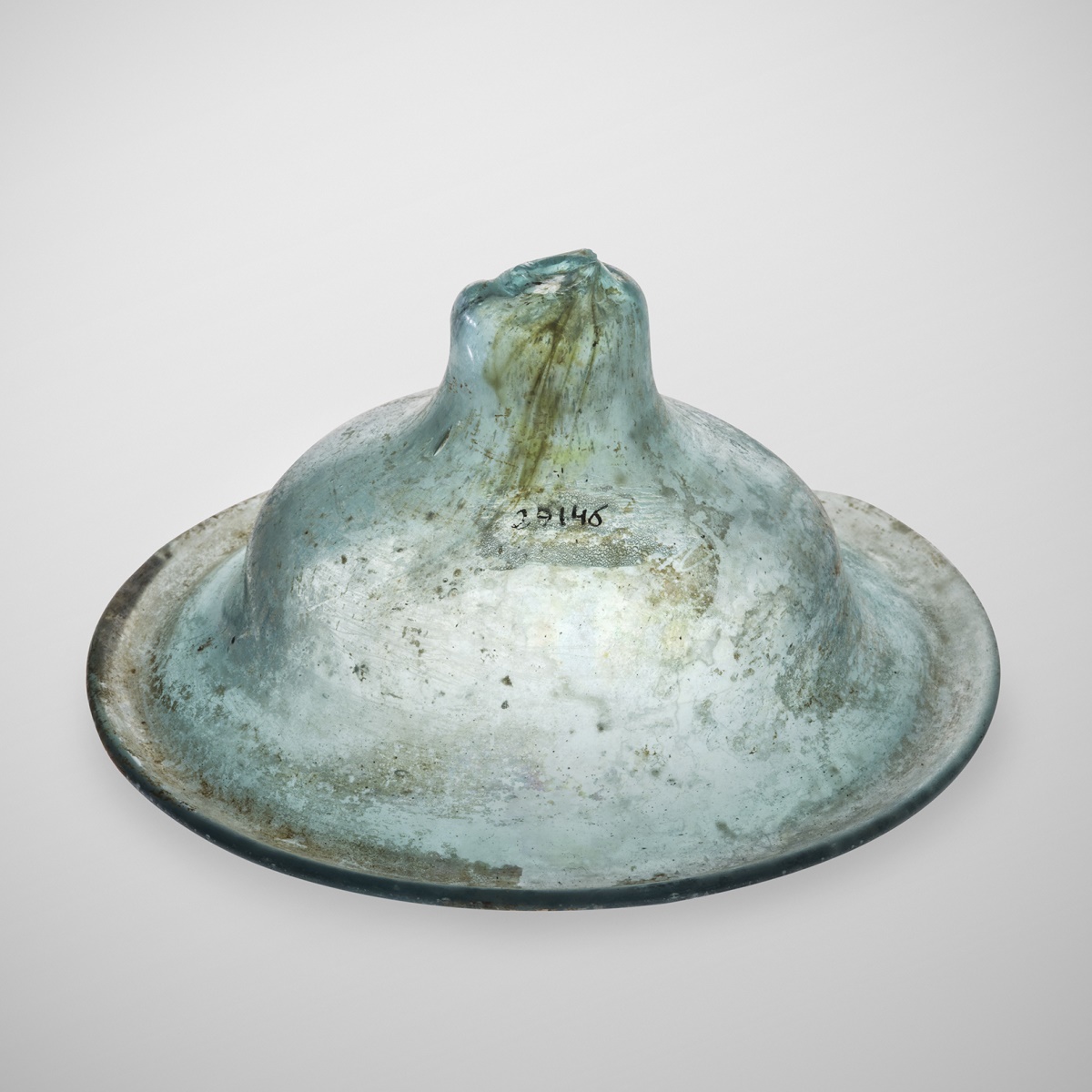 Couvercle de l'urne Inv. 29147, circulaire de même couleur (bleuté) et même qualité de pâte, sur laquelle il était posé. Ce couvercle est intact hormis un éclat sur son sommet. Nous ne savons pas si cette urne a été découverte avec son couvercle posé vers l'extérieur, comme sur le dessin, ou vers l'intérieur comme c'est parfois le cas. Réf. typologique : - Morin Jean : - - Isings : 66a - Lancel : - - Goethert-Polaschek : 153