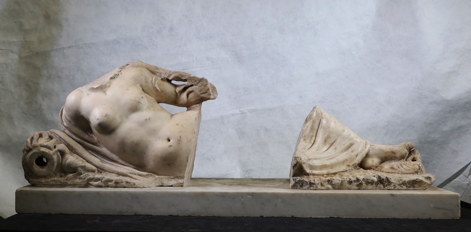 Le milieu du corps manque, ainsi que la tête et la main gauche. La nymphe, le torse nu, s'appuie du bras droit sur son urne près de laquelle est un oiseau ; un autre oiseau est à ses pieds. (E. Roschach, 1892) ; Nymphe couchée prenant appui sur une hydrie. La tête est manquante ainsi que la partie médiane du corps soit les hanches et les cuisses. La nymphe est couchée du côté droit, la main posée sur l'hydrie, le bras gauche disposé le long du corps et le genou gauche fléchi. Elle est drapée d'un voile recouvrant son bras droit, une partie de son bras gauche, sa hanche et ses jambes; le tout laissant apparaître son torse et son pied nus. Deux oiseaux sont disposés à ses côtés : l'un est placé près de l'hydrie, sous le drapé de la nymphe, l'autre est placé sous son pied gauche. L'identité de cette sculpture peut aussi être attribuée à une déesse fleuve. Souad MEKRABECH MARS 2012