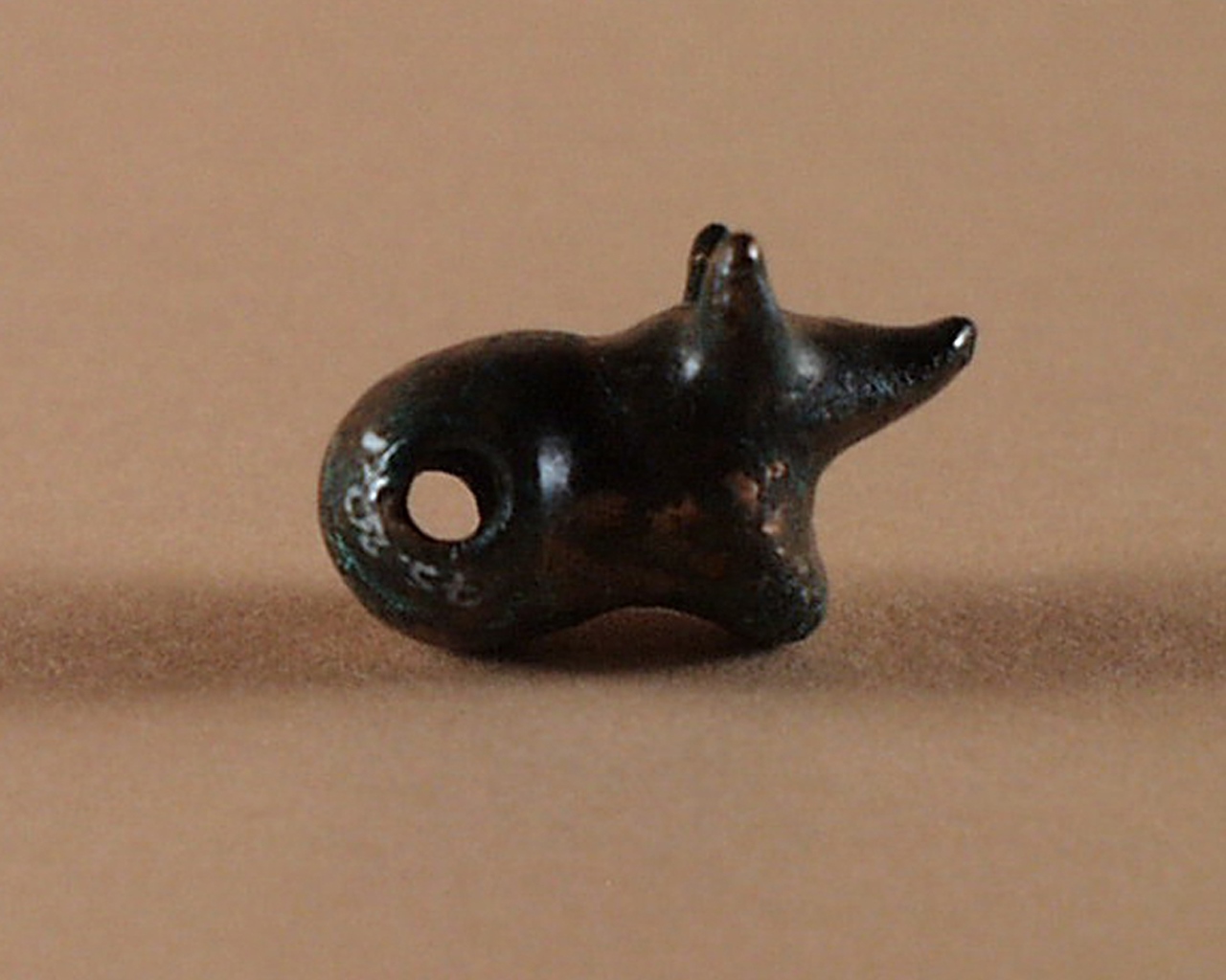 Perle en forme de tête de chien, au corps sphérique perforé en son centre. La tête de chien est stylisée avec l’intérieur des oreilles marqué par un creusement circulaire et le museau en biseau. La perle pouvait être portée en pendeloque ou cousue sur un vêtement. Anaell Viollat, 2016