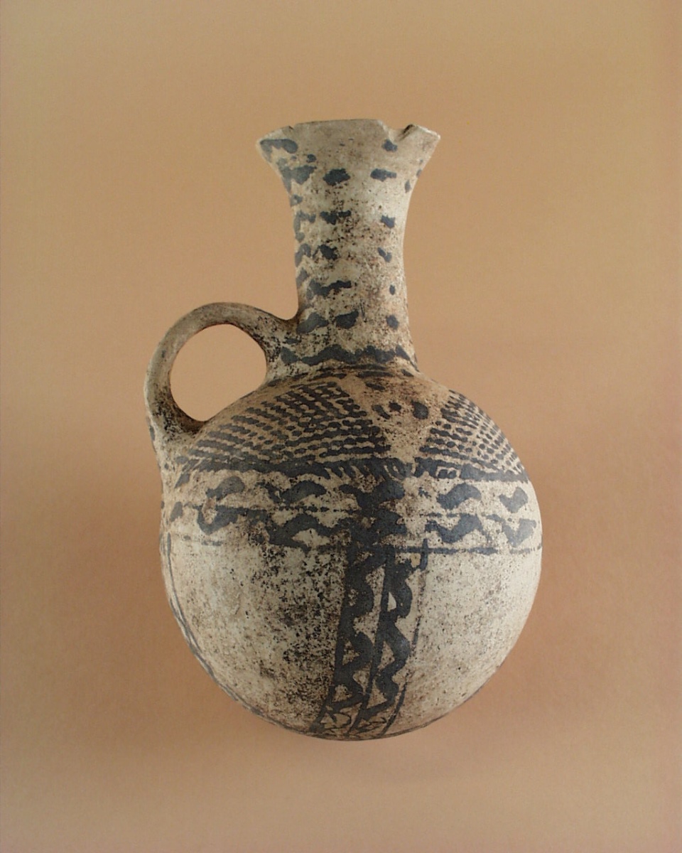 Décor peint en noir, en bandes ondées sur la panse, horizontales et verticales, celles-ci se croisant sur le fond bombé du vase ; sur l'épaule décor réticulé en triangles et ondes horizontales sur le col.