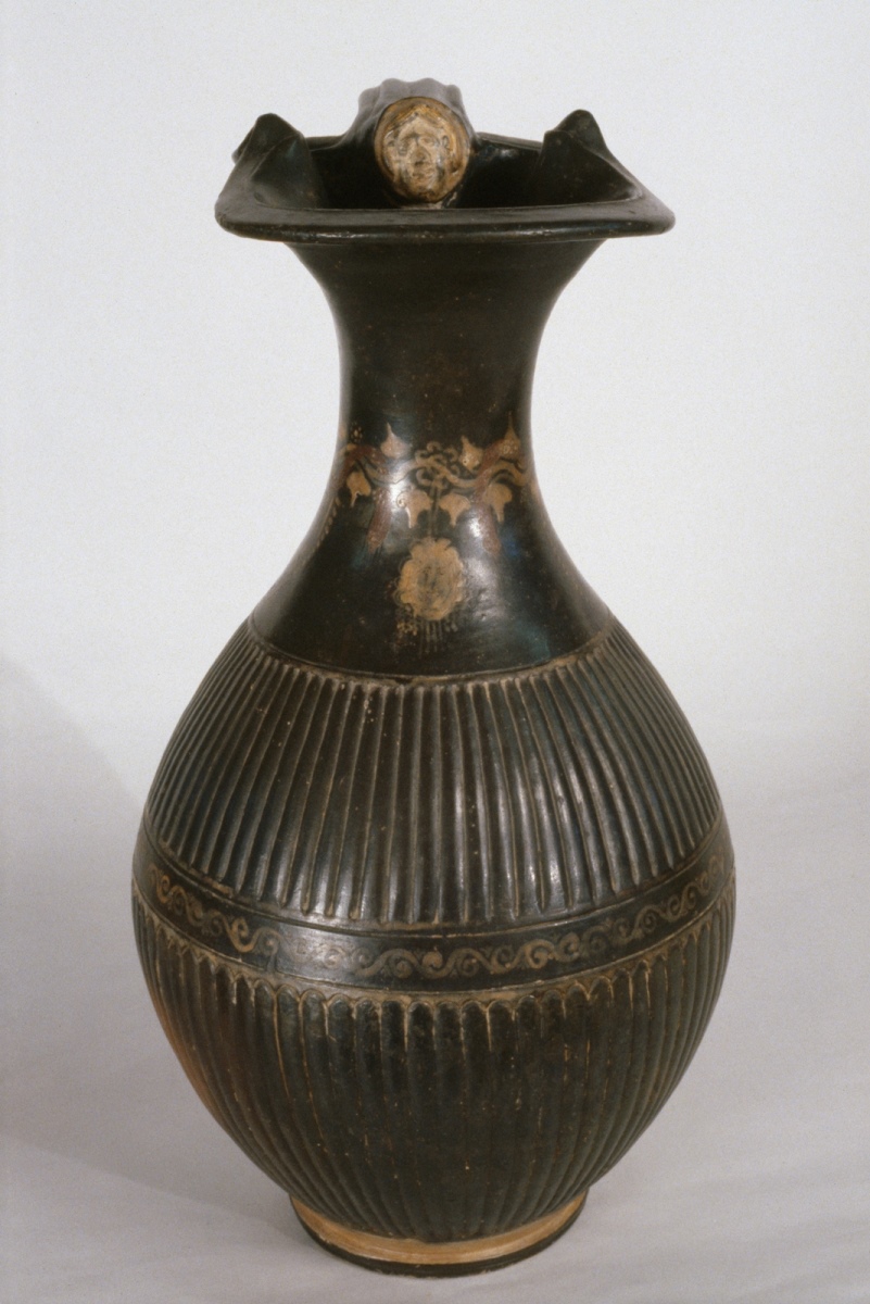 Oenochoé (pichet servant à puiser et servir le vin) à panse ovoïde, côtelée et divisée en deux zones par une frise horizontale de volutes. L'embouchure est trilobée et l'attache de l'anse est décorée d'une tête plastique. Le col possède un motif de rameau de lierre et d'un ruban auquel est suspendu un masque de théâtre. Ce masque féminin est un masque de la Nouvelle Comédie, symbolisant l'hétaïre, une concubine de haut rang de la Grèce Antique. Ce masque et le lierre relient ce vase au monde de Dionysos, le dieu du vin et du théâtre. Marie Nonclercq, 2016. ; Lettre de Trendall le 9 Juillet 1990. Il a montré le vase à JR Green : “I can see why one might thing it Campanian, but i still rather suspect that it is Apulian. It is not totally unknown for masks to be a bit odd when one is dealing with ribbed vases, and one runs into the kind of provincialism which is seen at its more extreme in the case I mentioned in the Schauenburg Festschrift”. Sur ce type de vase voir l’oenochoé n°inv 425 (Andreassi et alii, p.73, n°1.3.20) Décor différent mais côtelé de la même manière avec zone de frise au milieu de la panse, même protomé de lion en haut de l’anse. (apulien) Voir aussi Mise, 2010, n°6, p.174 (apulien) et n°172, p.307. Voir aussi Schmidt, 1991, pp.17-18, n°abb 15-16 Selon le tableau Lippolis, 1994 ou Mise, 2010, datation entre 325 et 275 av. n.-è. Mathieu Scapin