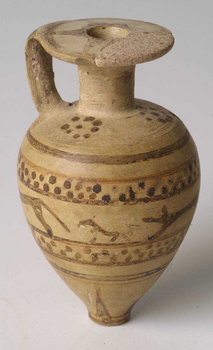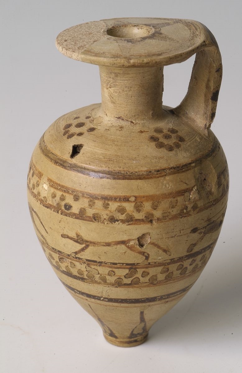 Sur le plan de la lèvre, arêtes rayonnantes partant de l'embouchure, dessinant une étoile à six branches. Anse décorée de quatre bandes horizontales. Sur l'épaule, trois rosaces composées de huit points. Sur la panse, filet brun, deux rangées de points entre deux filets. Frise d'animaux en course à gauche. Deux rangées de points entre deux filets. A la base de l'aryballe, filets et arêtes rayonnantes. Mathieu Scapin ; Décor en aplat brun tirant sur le jaune. Pas d'incisions ni de rehauts. Sur le plat de l'embouchure, une étoile à 6 branches qui s'inscrit dans un cercle. Anse décorée de 4 bandes horizontales. Sur l'épaule, 3 rosaces en pointillés ; puis, encadrée par 2 bordures garnies de points et par deux bordures vides de décor, une frise de quadrupèdes marchant les uns derrière les autres, à la file, vers la gauche. Il pourrait s'agir de chiens, l'un d'eux est dans le sens inverse. Les chiens sont dessinés de manière schématique, rappelant ainsi le "running dog style" de Payne. La base du vase est décorée de chevrons aigus, pointe vers en haut, et le dessous du pied devait sans doute être décoré d'un cercle. Forme d'aryballe piriforme pointu, anse qui se confond avec le plat de l'embouchure. Décor caractéristique de la période de transition entre le proto-corinthien et le corinthien ancien.