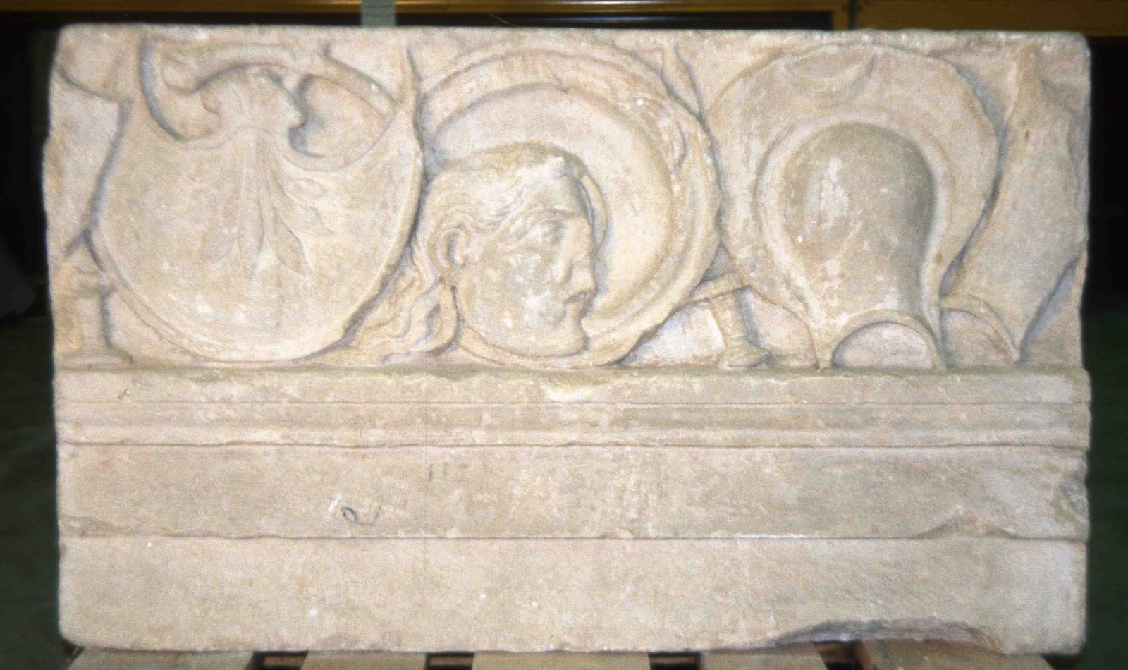 Cette section fait partie d'un ensemble de quatre sections d'un entablement comprenant une architrave à deux fasces et une frise d'armes qui ne se raccorde pas mais qui provient du même monument romain indéterminé, avec d'autres éléments toujours intégrés à l'architrave de l'église Saint-Just. Il se compose des thèmes suivants, de gauche à droite : Un morceau d'un bouclier (?) ; un glaive, un bouclier en pelte orné d'une palmette cachant en partie un buccin ou trompette courbe ; un bouclier rond (clipeus) sur l'intérieur duquel se détache une tête de femme ; un glaive ; une épaulière de gladiateur rétiaire ornée d'une lune ; un bouclier en tuile (?). Daniel Cazes, juin 2001