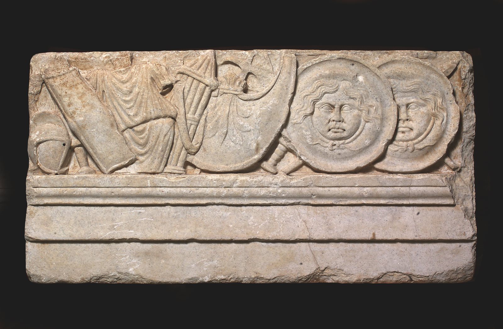 Cette section fait partie d'un ensemble de quatre sections d'un entablement comprenant une architrave à deux fasces et une frise d'armes, qui ne se raccorde pas mais qui provient d'un même monument funéraire romain, avec d'autres éléments toujours intégrés à l'architrave de l'église Saint-Just. Ce bloc se compose des thèmes suivants, de gauche à droite : Un casque à visière ; un glaive ; un bouclier en tuile ; une tunique ; un carquois fermé ; un bouclier en pelte orné d'une palmette ; une hache d'armes, un glaive et une lance cachés par deux boucliers ronds (clipei) timbrés de têtes de gorgones. Claudine Jacquet, 2016