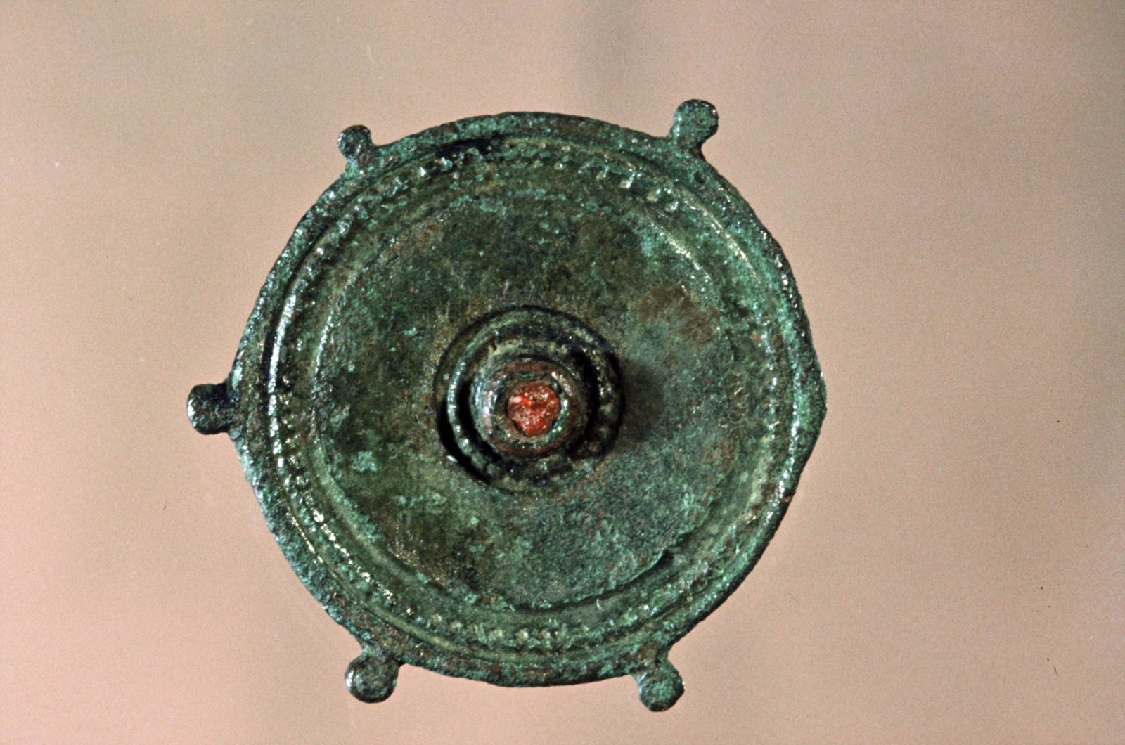 Fibule dont le disque est décoré de cercles concentriques. Sur le bord extérieur, huit petites protubérances. Restent le ressort et l'ardillon. Monique Rey
