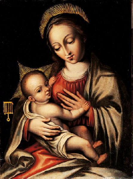 Ce tableau était l'une des quarante pièces offerte au Monastère de L'Escorial, en Espagne, par le Roi Philippe II (1527-1598). En 1809 des soldats français pillèrent le couvent et les moines furent expulsés par décret du ' Roi Intrus ' Joseph, frère de Napoléon. Cette peinture, parmi les six ou sept qui, cachées, échappèrent aux envahisseurs, fut restituée au monastère avec d'autres biens par le Roi Ferdinand VII en 1819. A gauche un gril, symbole de saint Laurent qui fut brûlé sur un gril au 3e siècle sous l'Empereur Valérien ; La Vierge vêtue d'un manteau vert et d'une robe rouge présente de sa main gauche, son sein recouvert à l'enfant, enveloppé dans un linge blanc ,qu'elle tient de la main droite sur ses genoux. Tous deux sont auréolés d'un limbe doré formé de rayons, couronne pour la mère, carré concave évoquent la croix pour l'enfant. A gauche au premier tiers, est peint un gril doré de petite taille qui évoque le martyre de saint Laurent et l'Escorial, palais royal de Philippe II.