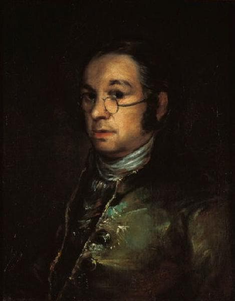 L'Autoportrait aux lunettes [...], se place à la charnière du XVIIIe siècle finissant, porteur d'idées nouvelles dans une mouvance européenne auxquelles le peintre prête toute son attention et le début du XIXe siècle. L'artiste a cinquante-trois ans ; il est au faîte de sa gloire en sa qualité, nouvelle en 1799, de premier peintre de la Chambre. Il s'est aussi acquitté la même année de la série gravée des Caprices qui, outre l'incompréhension voire la vindicte, préfigure la quête que poursuivra le maître, parallèlement à l'art plus officiel qui le fait vivre. À un siècle et demi de distance et à l'instar de son célèbre devancier, Diego Velázquez dans Les Ménines (1656), Goya connaît le privilège suprême d'être autorisé à se représenter auprès de la famille royale dans La Famille de Charles IV (Prado, 1800). Jean-Louis Augé souligne la similitude de la pose de l'artiste dans cette dernière oeuvre avec celle de l'Autoportrait de Castres laquelle devient par là, l'affirmation de cet événement majeur. Les autoportraits de Goya jalonnent sa vie. Mais, s'il en est un qui, en corrélation avec celui de Castres, retient l'attention, c'est celui recensé comme étant le plus ancien authentifié (collection privée, v. 1769 - 1775) et qui fut présenté par BBV durant l'exposition ' Goya en las colecciones españolas ' (1995-96). Quoique une trentaine d'années les séparent, les points de convergence entre les deux peintures sont nombreux. Outre les dimensions très voisines (58 cm x 44 cm contre 61,5 cm x 47,8 cm pour celui du musée Goya), le fond, neutre, est traité de la même manière en camaïeu de bruns ; la hauteur du buste est la même ; la veste est négligemment ouverte ; une cravate blanche entoure le cou massif ; l'oreille est plus suggérée que traitée dans sa réelle anatomie. La chevelure, plus dense dans la première version, est toujours tirée en arrière ; les favoris sont plus fournis et plus longs dans l'Autoportrait de Castres et quelques cheveux blancs sont apparus. Somme toute, chez l'homme mûr, les traits ne se sont guère empâtés après trente années écoulées : les joues sont aussi pleines, les lèvres charnues, le front haut, l'épaisseur du menton toujours présente, le menton fort et volontaire. La lumière, dans le même axe, vient traduire la carnation en détachant le visage sur le fond sombre. Seule notable différence, dans l'oeuvre de jeunesse, les yeux semblent très enfoncés alors que dans l'Autoportrait aux lunettes ils semblent beaucoup plus saillants, la pupille dilatée par le jeu du regard scrutateur. Fait notable, Goya affirme son regard sans user d'un éclat blanc dans la prunelle ou l'iris de l'oeil : le regard reste intense sans cet artifice ! A ce titre, il est intéressant de noter qu'inversés l'un par rapport à l'autre, les deux autoportraits se superposent étroitement. En 1787, Goya écrit à Zapater que sa vue a faibli et qu'il doit porter des lunettes. Son regard, par-dessus les lunettes, trahit la presbytie. Néanmoins, leur port dans cette oeuvre n'est pas superfétatoire : si elles ne lui sont pas utiles pour saisir l'image dans le miroir placé à quelque distance, elles s'avèrent sans doute précieuses pour la restituer sur la toile, placée à distance plus raisonnable. Goya aurait pu se priver de les représenter par coquetterie. Il n'en est rien : il pose sur lui-même un regard lucide, dénué de complaisance, sur ce qu'il est exactement dans l'instant représenté. L'axe médian vertical traversant l'oeil gauche de l'artiste vient conforter cette sensation d'extrême acuité. Le vêtement, de soie ou de velours vert, est traité en glacis polychromes qui en restituent les moirures ce qui renforce le visage traité en pâte orangée. L'épaulement, plus suggéré que dessiné, est fait d'un cerne noir. Des éclats de blanc sur les boutons et le devant de la veste ajoutent à la densité de la composition par le jeu de la lumière. D'apparence ' anarchiques ' dans leur pose très empâtée, quand on les considère à peu de distance, c es glacis révèlent à la fois leur pertinence quand on s'éloigne de l'oeuvre et la maestria atteinte par Goya pour la fulgurance du rendu avec, comme toujours, une certaine économie de moyens. Il n'est qu'à considérer le traitement, relativement simple, de la veste dans son Autoportrait de jeunesse pour mesurer le chemin parcouru par l'artiste. Extrait du cat. exp. Madrid / Bilbao, 2002/2003, D. Gasc