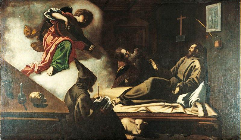 scène (saint François d'Assise, extase, couché, lit, ange, musicien, luth, moine : franciscain, livre, chandelle, agneau, crâne, intérieur)