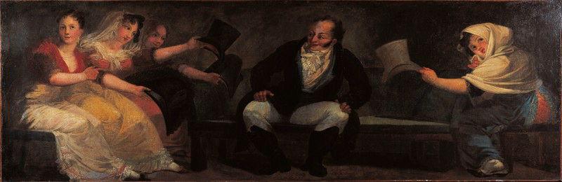 Cinq personnages composent le tableau : au centre un homme assis sur un banc, les mains appuyées sur ses genoux, regardant les trois femmes assises sur sa droite, qui lui tendent des chapeaux haut de forme. Une autre femme est assise sur le côté droit du tableau; elle tend un chapeau haut de forme de son bras gauche et regarde le spectateur.