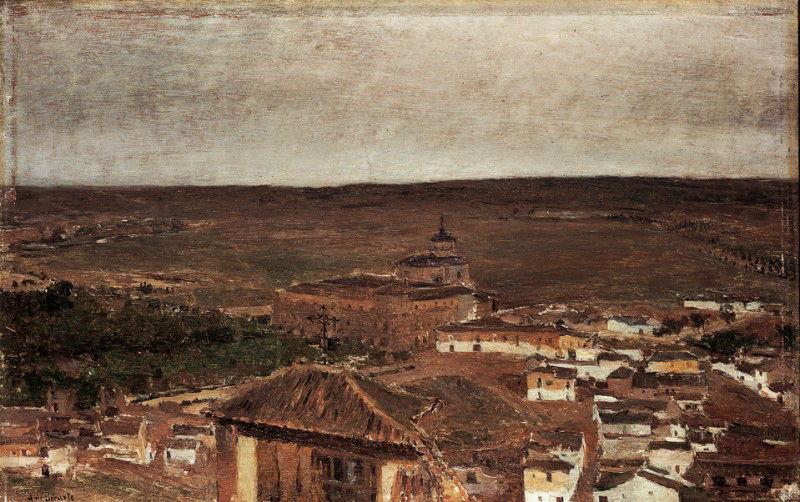 Aureliano de Beruete y Moret, élève de Carlos de Haes, va lors d'un voyage à Paris en 1878 découvrir l'école de Barbizon. Admirateur inconditionnel de Velázquez, il sera son premier biographe moderne en publiant, en 1897, un ouvrage très remarqué sur le tableau des Ménines [...] Les environs de Tolède nous offrent une vue plongeante sur un paysage ouvert, aux tonalités brunes et ocre. Là encore nous retrouvons toute la prédilection du peintre pour les paysages arides qui, à eux seuls, exaltent l'idée d'une Espagne éternelle, célébrée par les artistes et écrivains de la génération de 1898. Extrait du cat. Paribas, 1997, J. L. Augé