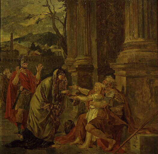 scène (Bélisaire, général, gueux, aveugle, garçon, bâton, casque, femme, don, soldat, étonnement, homme, à l'antique, temple, colonne)