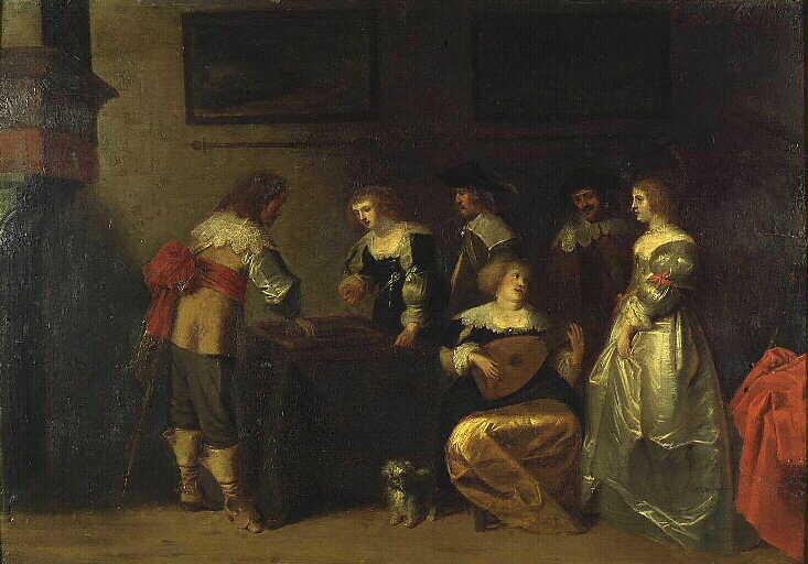 vue d'intérieur (femme, homme, jeu, musique, luth, chien)