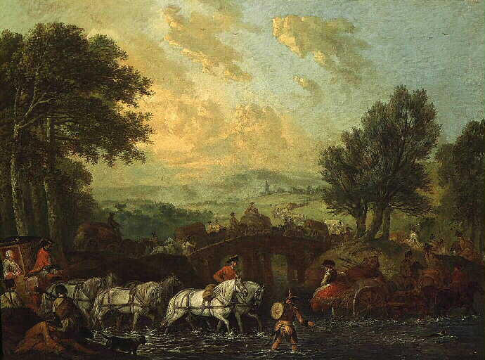 scène (armée, pont, rivière, voiture à attelage : cheval) ; fond de paysage