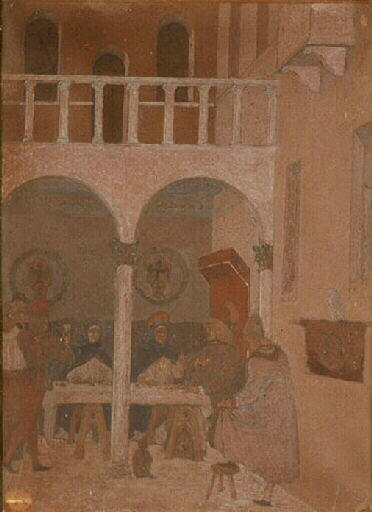 vue d'intérieur (architecture d'habitation, moine, repas)
