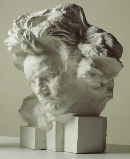 Ce grand plâtre appartient à la série des variations sur le thème de Beethoven que Bourdelle traita tout au long de sa vie, à partir de 1887 jusqu'à sa mort en 1929. Il s'agit du Beethoven dit aux grands cheveux que le sculpteur mit au point en 1891 à partir d'un masque conçu en 1889. Témoin des premières recherches sur la figure du musicien, sa 'troisième sculpture de Beethoven' telle que Bourdelle la désigne, constitue un jalon essentiel de son travail. Cette version marque en effet pour le sculpteur l'entrée dans la démesure, notion qu'il juge seule apte à rendre le caractère de son génial héros. Ainsi il change de dimensions, optant pour une échelle plus grande que nature, il amplifie les formes, enfle les volumes, gonfle certaines parties du visage, tout cela afin de donner une image sans pareille du compositeur auquel il s'identifie