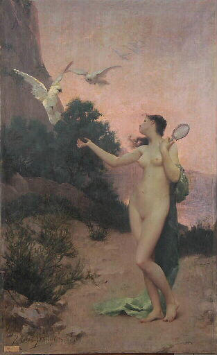Une jeune fille nue tient un miroir de la main gauche et présente la main droite à des oiseaux