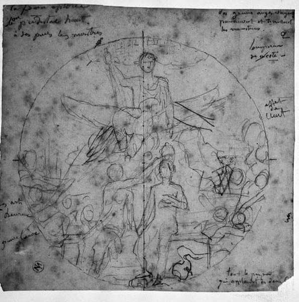 Il s'agit d'une étude pour une peinture de J.A.D. Ingres, intitulée le 'Couronnement de Napoléon II'. Momméja écrit : 'Composition dessinée vers 1854, pour un plafond que le maître rêvait de peindre à l'Hôtel de Ville pour faire pendant à celui de l''Apothéose de Napoléon Ier'. On peut douter qu'à son grand âge, Ingres ait imaginé pouvoir peindre deux toiles aussi grandes ! Il semble plutôt raisonnable de penser que le 'Couronnement de Napoléon III', sorte d'allégorie du plébiscite de 1851, fut un premier projet pour le même plafond de l'Hôtel de ville. On évita peut-être, à une époque où la situation politique était encore instable, de trop insister sur la personne même de Louis Napoléon, traité ici comme le héros de la composition. Napoléon Ier, pour sa part, ne fait ici qu'une apparition - significative - dans le ciel. ; Il s'agit d'un tableau de J.A.D. Ingres, intitulé le 'Couronnement de Napoléon III' datant environ de 1852. Ce tableau était un projet pour le plafond de l'Hôtel de ville de Paris.