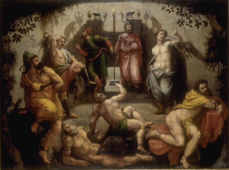 Attribué à Gillis Coignet par Nicole Dacos-Crifo (Catalogue de l'exposition Fiamminghi a Roma, Bruxelles, Palais des Beaux-Arts, 1995), cette attribution est remise en question depuis le 10 août 2011 par Peter Carpreau (conservateur, musée de Louvain) qui pense qu'il pourrait s'agir d'une oeuvre de Michiel Coxcie. En effet, le tableau a été peint sur bois de peuplier, donc en Italie (le tableau a d'ailleurs été acquis en 1964 comme étant de l'école italienne), même s'il est incontestablement attribuable à un peintre flamand. Parmi les peintres flamands présents en Italie au 16ème siècle se trouve Michiel Coxcie, dont par ailleurs certains éléments présents dans la composition rappellent le style (les têtes en bas à droite, la bonne connaissance des oeuvres des artistes italiens du début du 16ème siècle...). ; Attribué à Coignet par Nicole Dacos-Criffo en 1996.