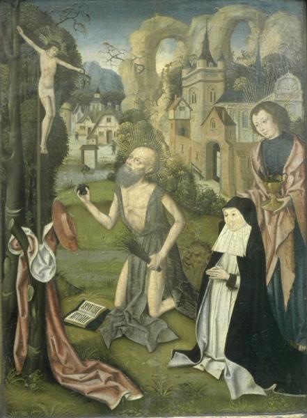 Saint Jérôme, figure hagiographique, en habit de pénitent, agenouillé devant un crucifix, tient dans ses mains des verges et une pierre avec laquelle il se frappe la poitrine. Une religieuse bénédictine prie sous la protection de saint Jean l'Evangéliste, qui tient un calice d'où sort le dragon mystique.