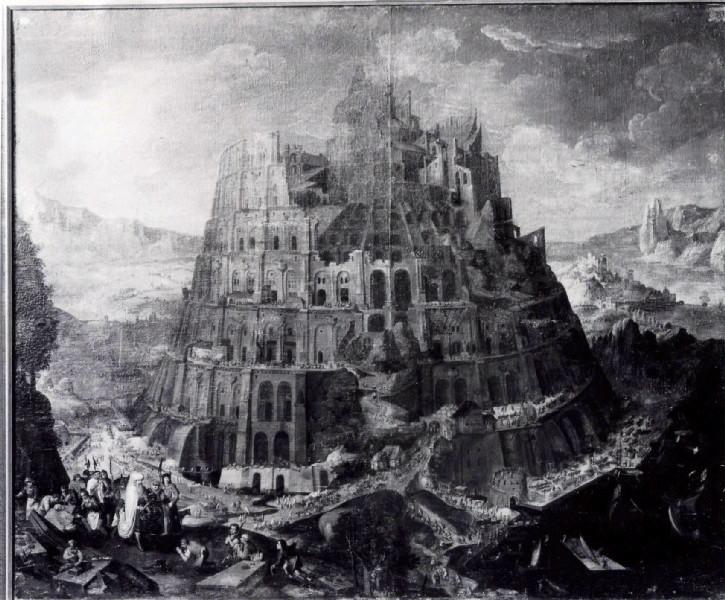 Cette oeuvre doit être rapprochée de la 'Tour de Babel' peinte par Brueghel l'Ancien et exposée à Rotterdam (1563, musée Boijmans van Beuningen). Le catalogue de 1807 mentionne que la toile est signée Brueghel. Dans la liste des dommages de guerre établie en 1948, il est spécifié que la toile est une copie ancienne. ; en rapport avec : Tour de Babel ; Copie de la 'Tour de Babel' par Brueghel l'Ancien conservé au musée Boijmans van Beuningen de Rotterdam.