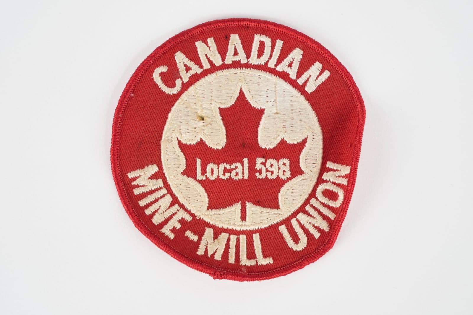 Ecusson circulaire en tissu rouge et blanc "CANADIAN MINE-MILL UNION LOCAL 598"