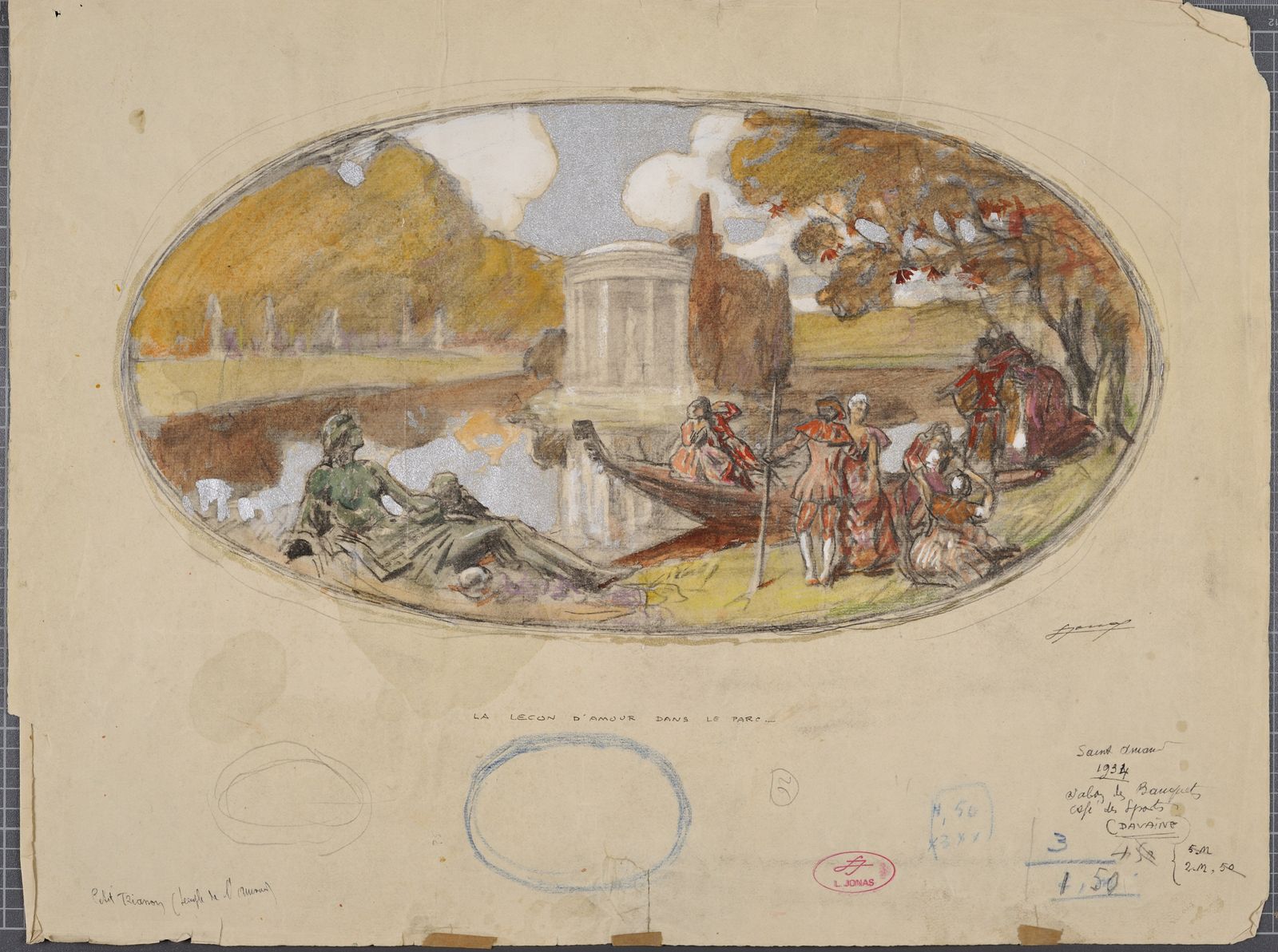 L. JONAS (S.b.d.) ; LJ L.Jonas (cachet b.v.d.) ; la leçon d’amour dans le parc (T.b.c.) ; petit trianon (temple de l’amour) (annotations b.g.) ; Saint-Amand 1934 (situé et D.b.d.) ; la musique ; petit Trianon pavillon sur jardin français ; salon des banquets ; (Davaine) ; 5m ; 2m,50 (annotations b.d.)