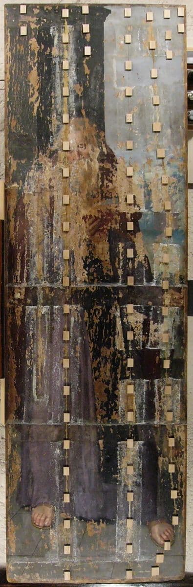 Provient de l’Abbaye de Saint-Amand-les-Eaux. Panneau gauche d’un tryptique dont la partie centrale a disparu. Exposé à l’Echevinage avant 1975.