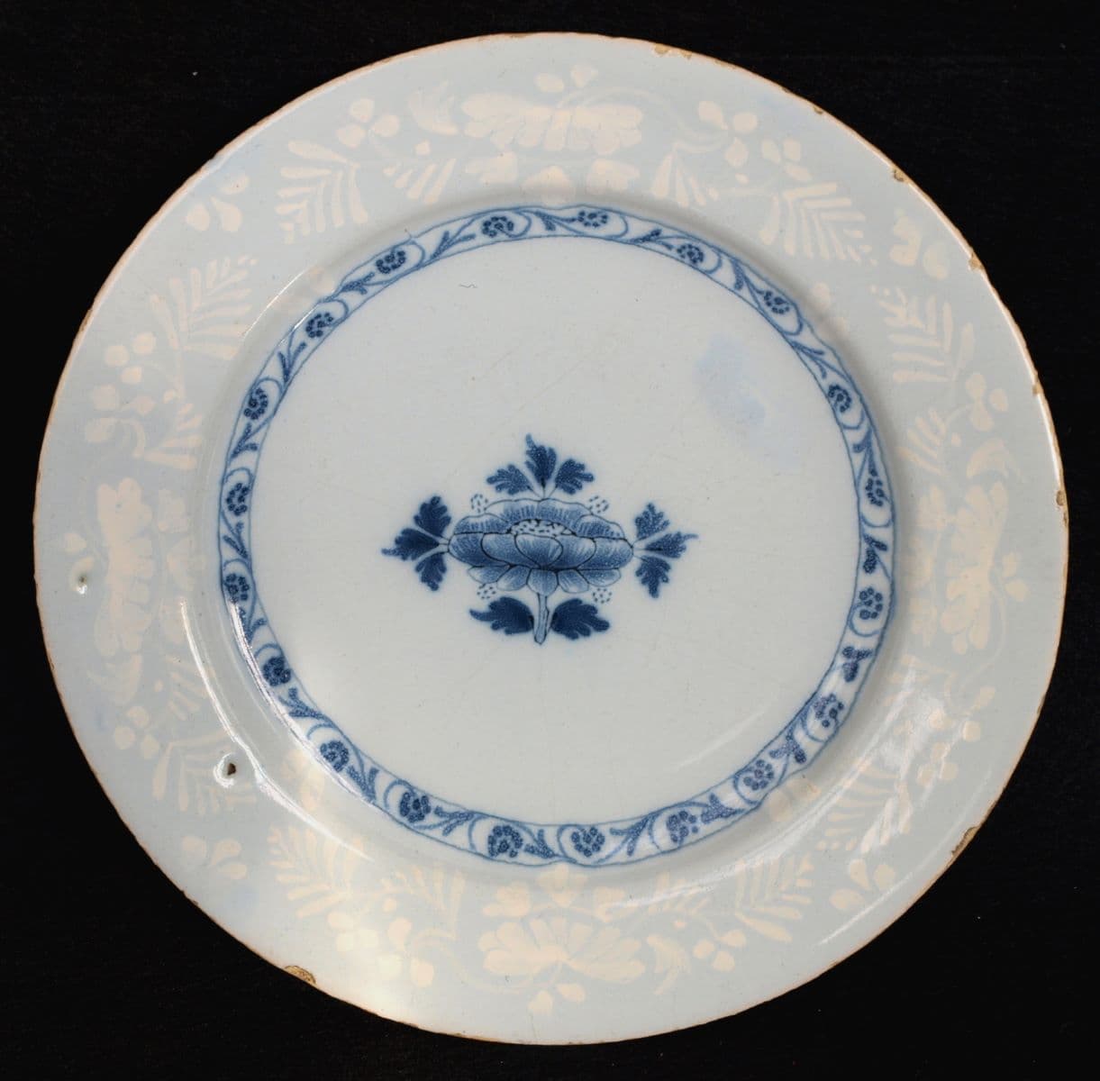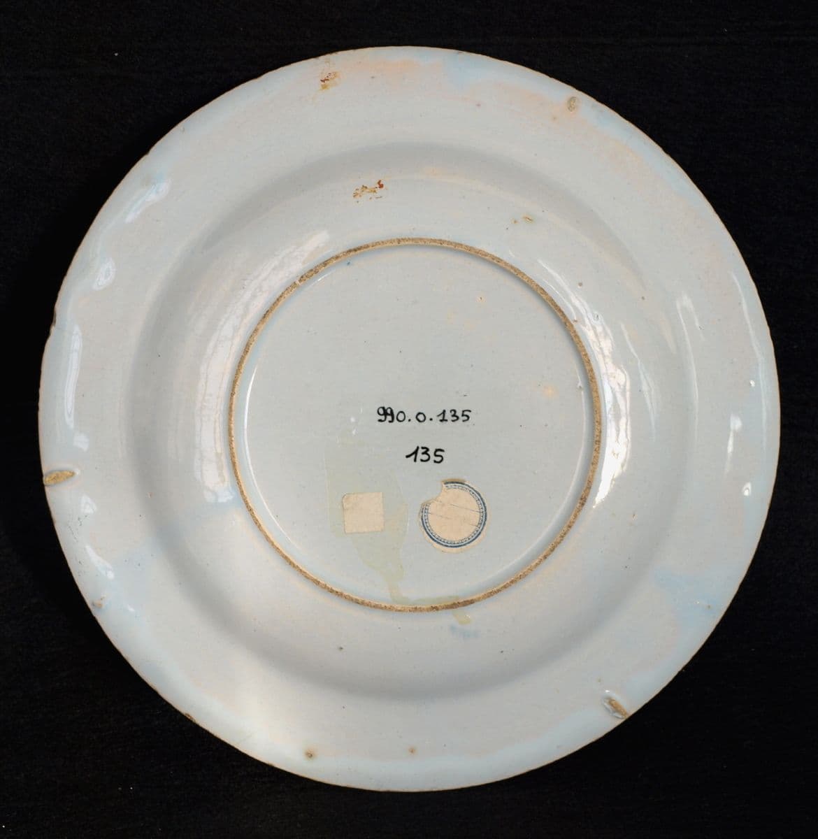 assiette en faïence stannifère de grand feu à décor en camaïeu bleu au chrysanthème, avec rehauts de fleurages sur l’aile. Galon d’enroulements végétaux sur le marli. Bord uni. Email gris-bleuté. De forme circulaire, dessous à talon.
